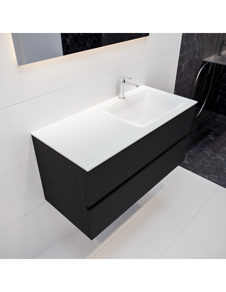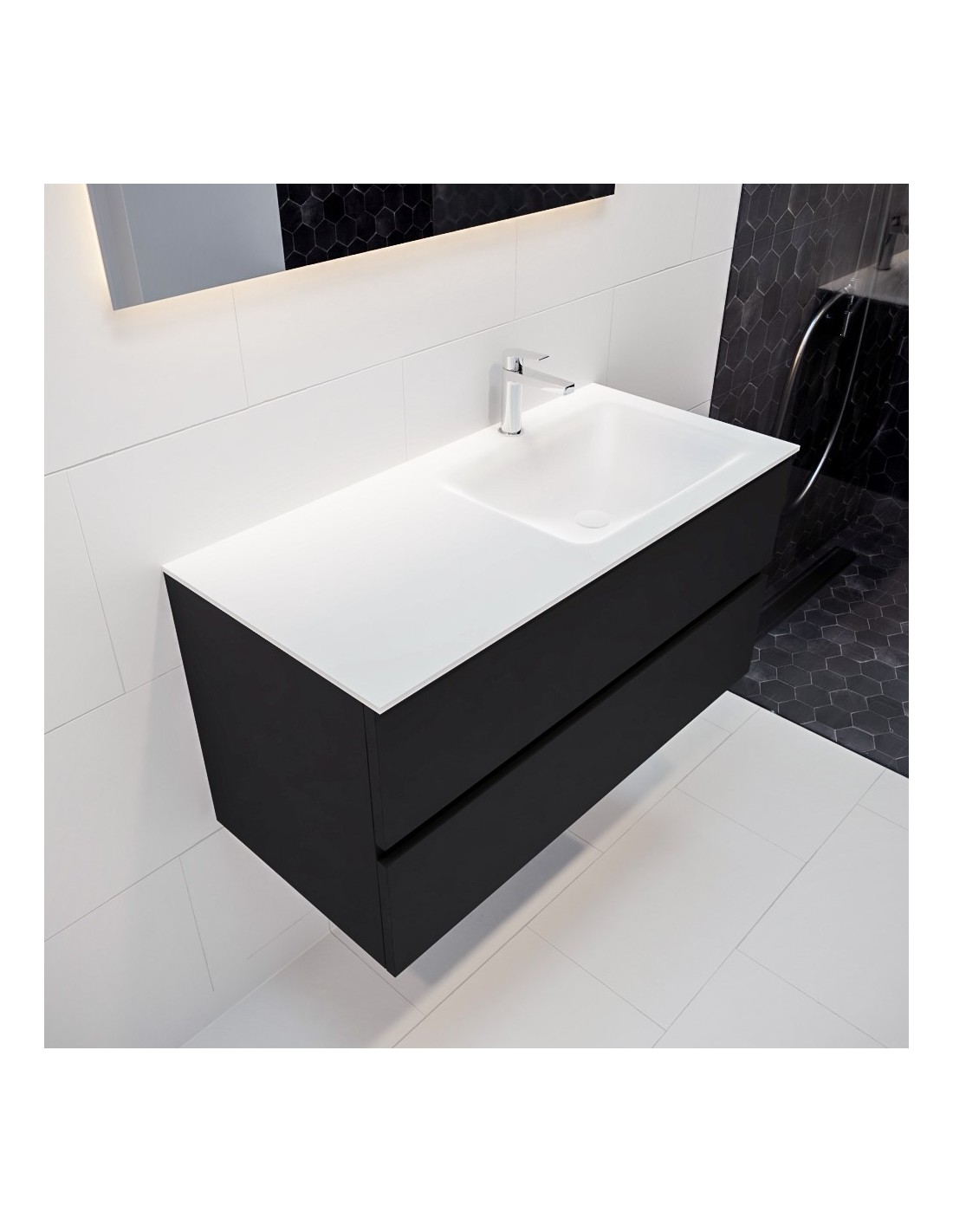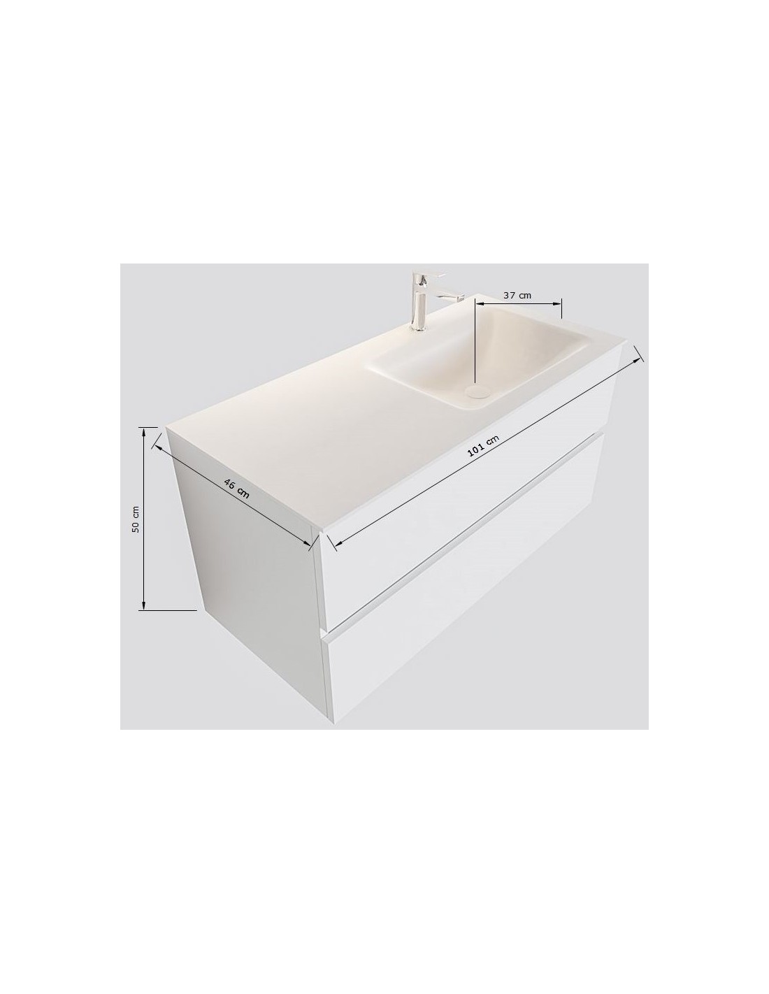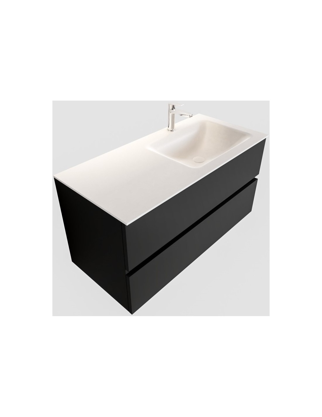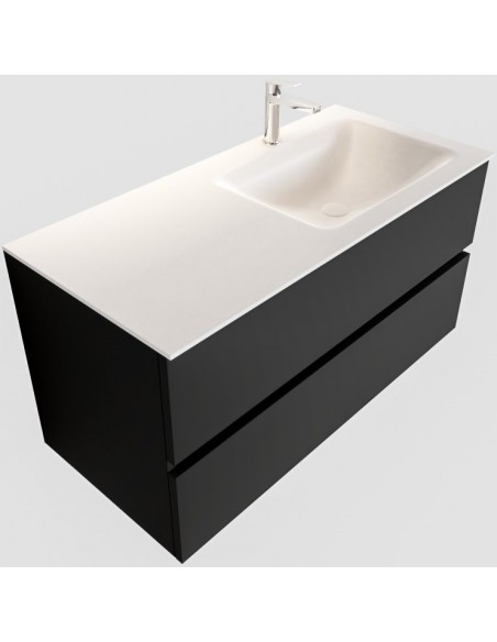VICA Komplet badmiljø med højrevendt håndvask til bordmonteret armatur. Badmiljøet kommer med 2 skuffer med fuldt udtræk, og er fremstillet i MDF. Håndvasken er fremstillet i talkum farvet (mat hvid) solid surface. Badmiljøet måler 100 cm i bredden. Det viste armatur medfølger ikke i sættet.