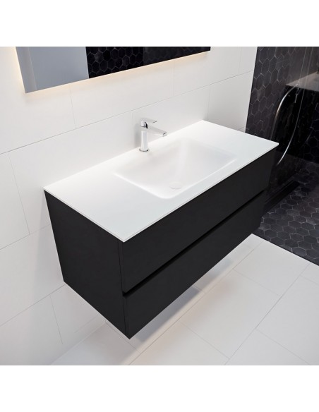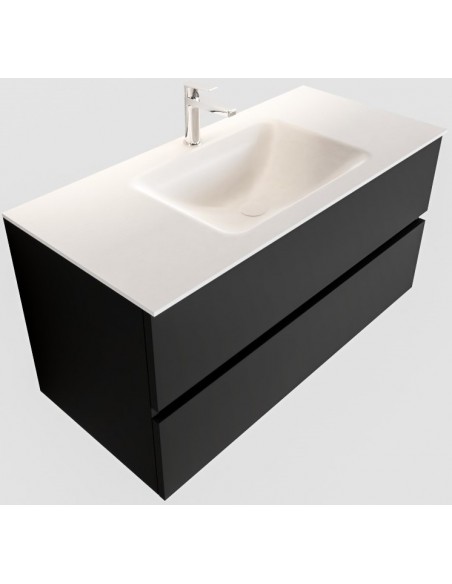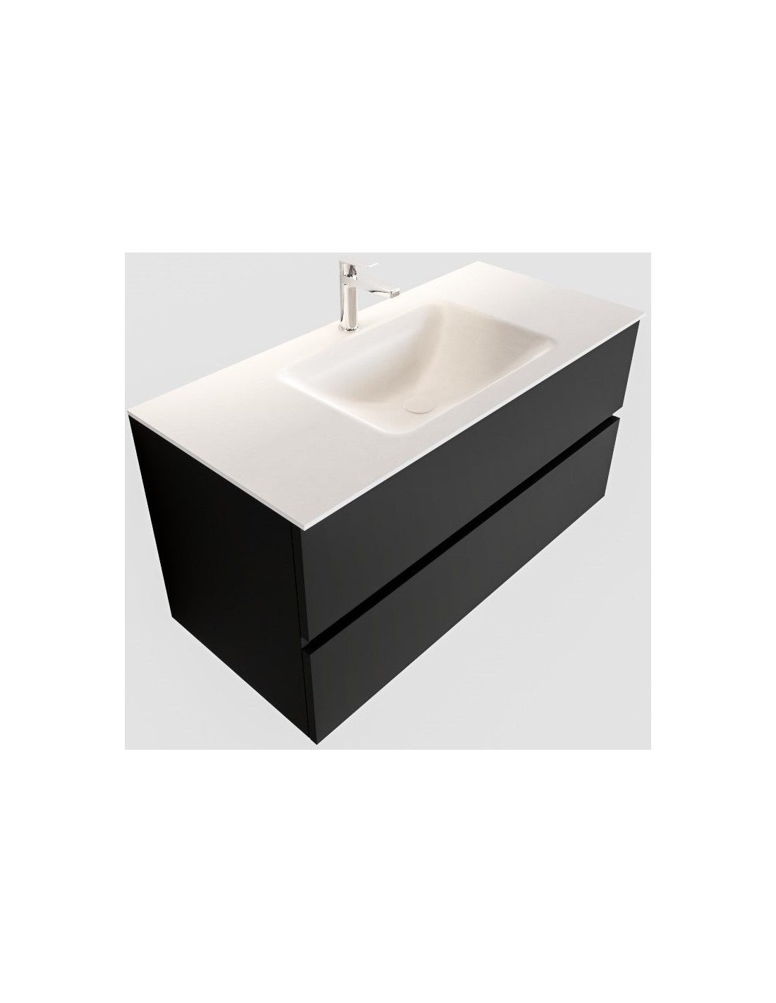 VICA Komplet badmiljø med midt centreret håndvask til bordmonteret armatur. Badmiljøet kommer med 2 skuffer med fuldt udtræk, og er fremstillet i MDF. Håndvasken er fremstillet i talkum farvet (mat hvid) solid surface. Badmiljøet måler 100 cm i bredden. Det viste armatur medfølger ikke i sættet.