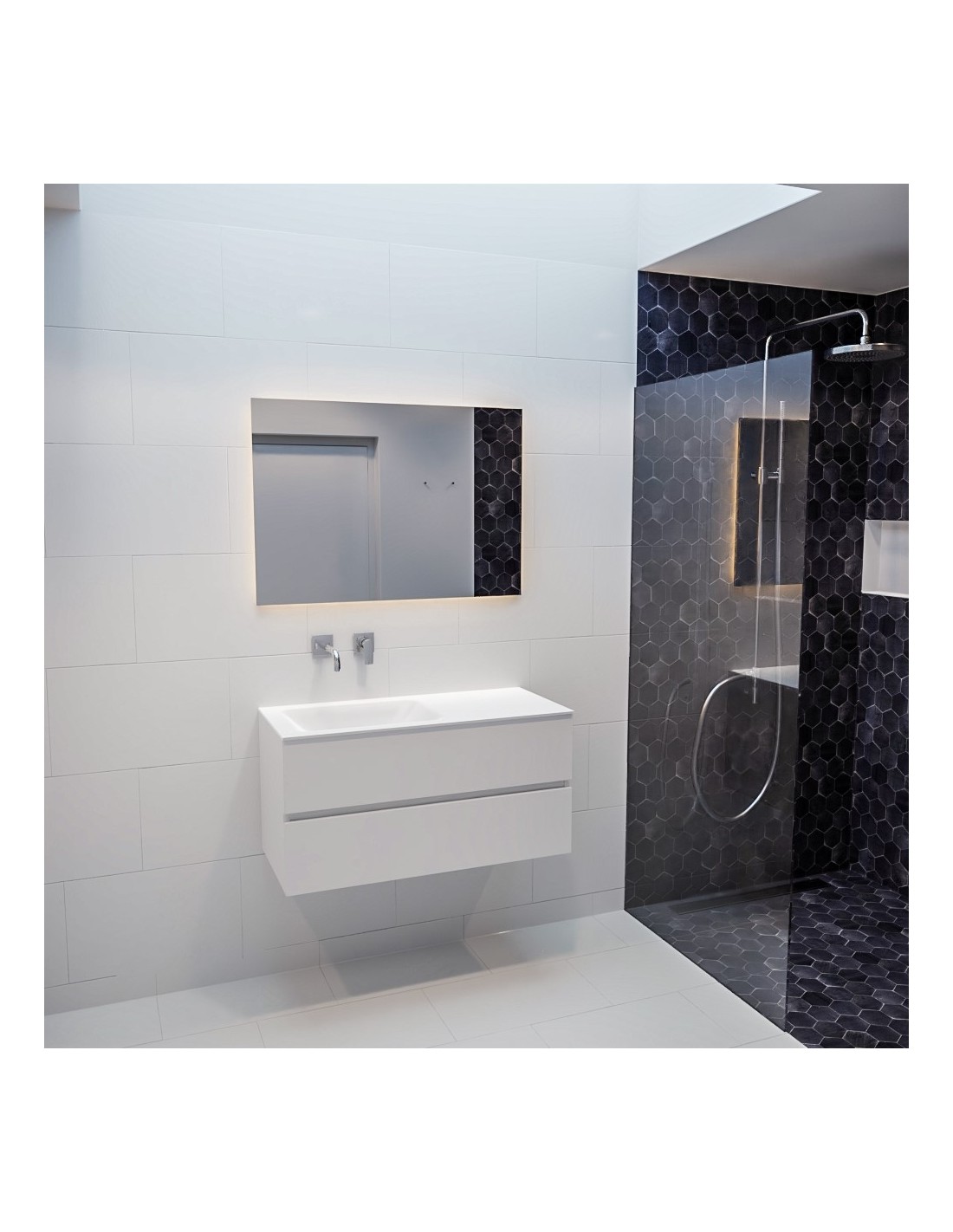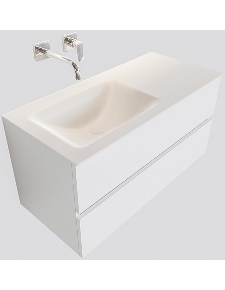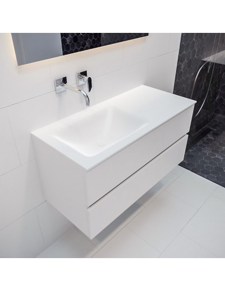 VICA Komplet badmiljø med venstrevendt håndvask til vægmonteret armatur. Badmiljøet kommer med 2 skuffer med fuldt udtræk, og er fremstillet i MDF. Håndvasken er fremstillet i talkum farvet (mat hvid) solid surface. Badmiljøet måler 100 cm i bredden. Det viste armatur medfølger ikke i sættet.