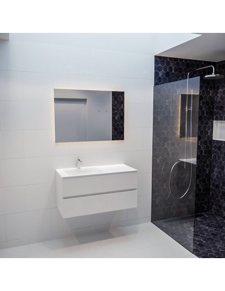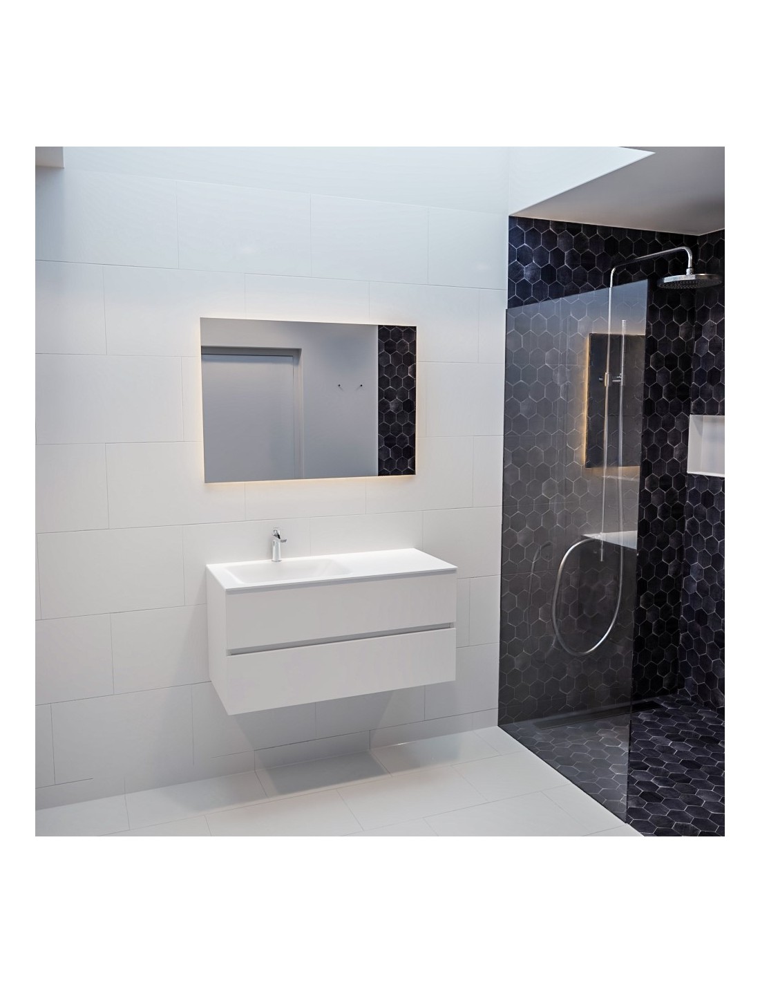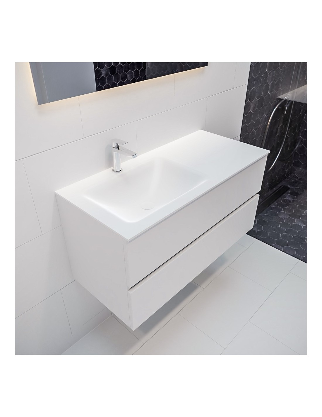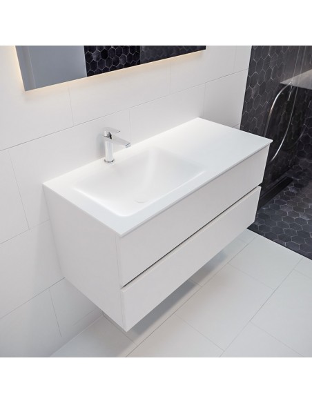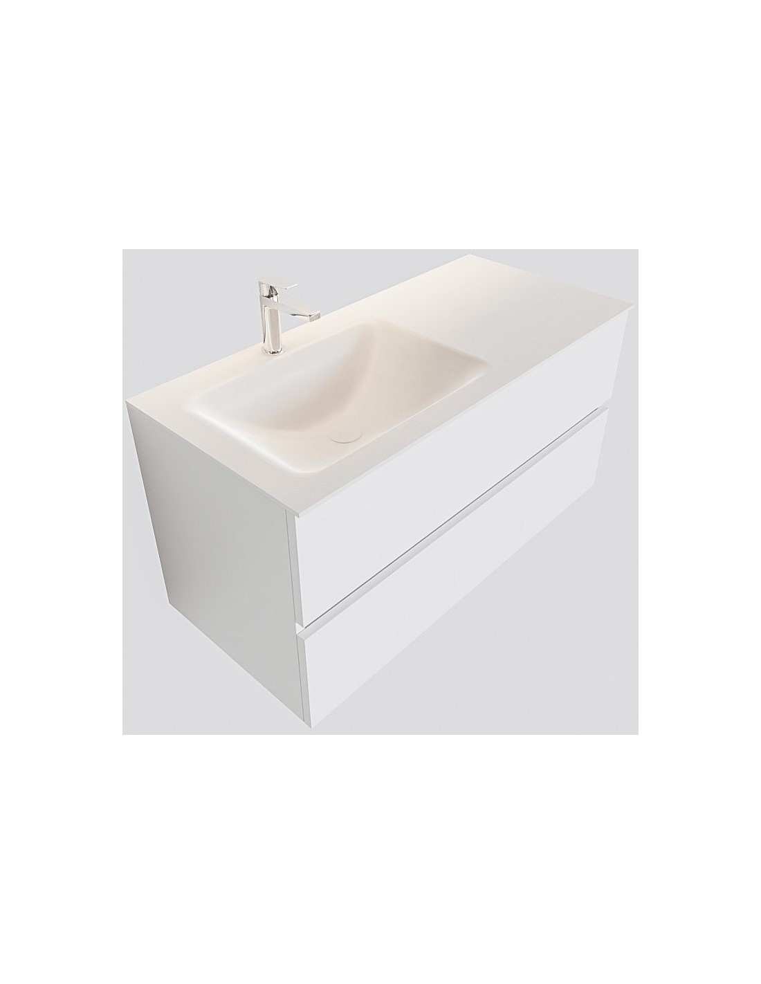 VICA Komplet badmiljø med venstrevendt håndvask til bordmonteret armatur. Badmiljøet kommer med 2 skuffer med fuldt udtræk, og er fremstillet i MDF. Håndvasken er fremstillet i talkum farvet (mat hvid) solid surface. Badmiljøet måler 100 cm i bredden. Det viste armatur medfølger ikke i sættet.