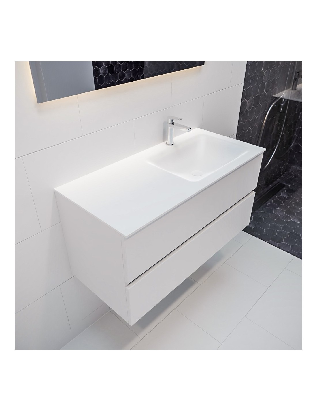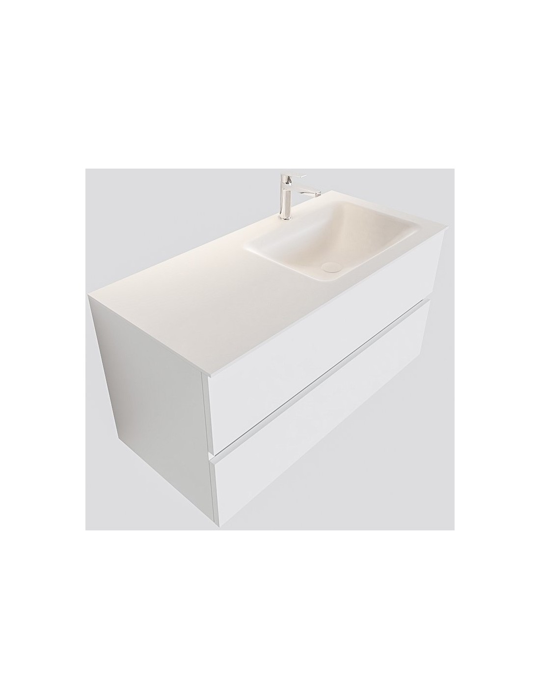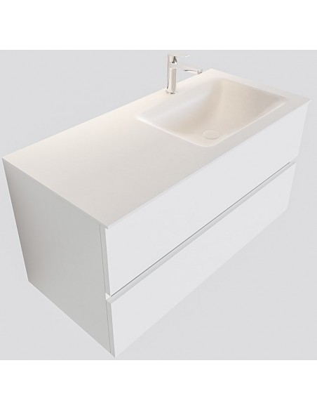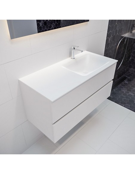 VICA Komplet badmiljø med højrevendt håndvask til bordmonteret armatur. Badmiljøet kommer med 2 skuffer med fuldt udtræk, og er fremstillet i MDF. Håndvasken er fremstillet i talkum farvet (mat hvid) solid surface. Badmiljøet måler 100 cm i bredden. Det viste armatur medfølger ikke i sættet.