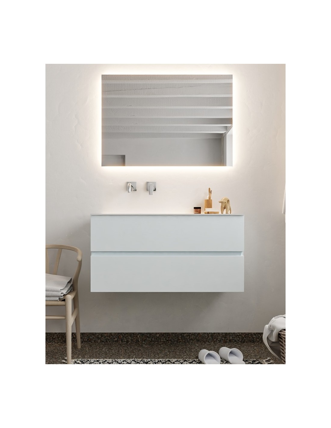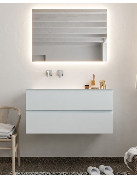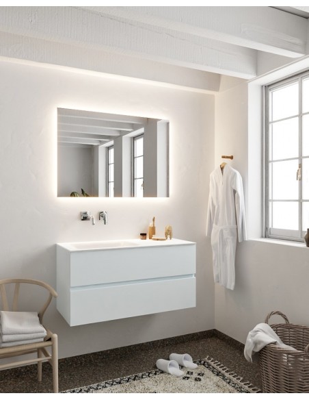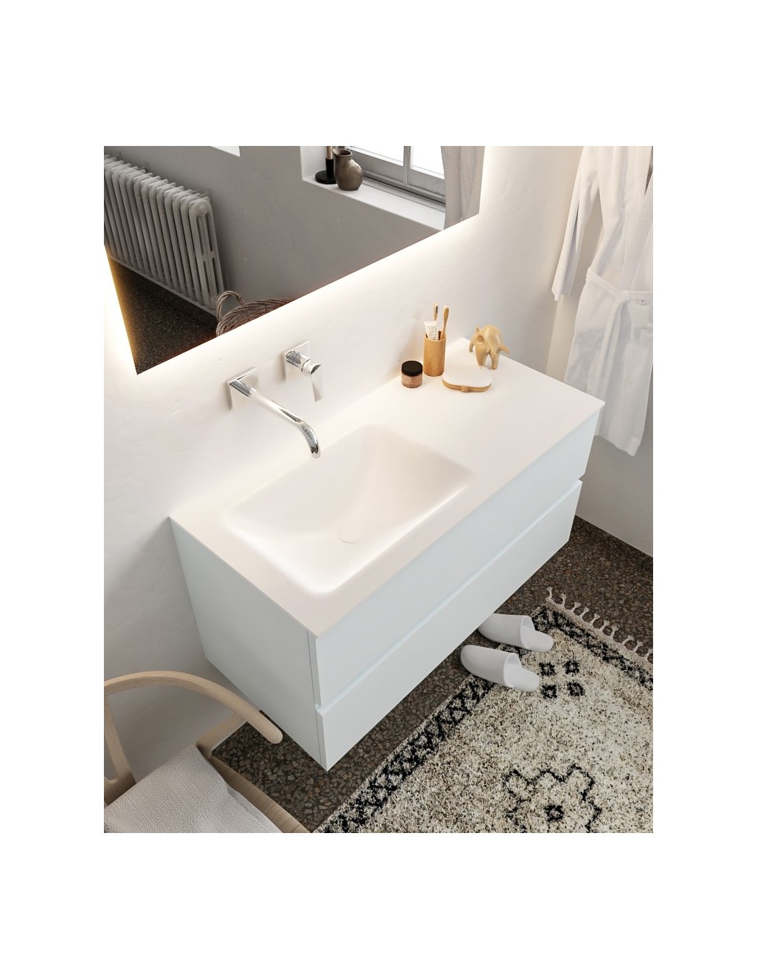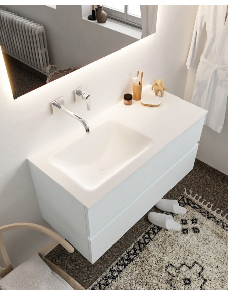 VICA Komplet badmiljø med venstrevendt håndvask til vægmonteret armatur. Badmiljøet kommer med 2 skuffer med fuldt udtræk, og er fremstillet i MDF. Håndvasken er fremstillet i talkum farvet (mat hvid) solid surface. Badmiljøet måler 100 cm i bredden. Det viste armatur medfølger ikke i sættet.