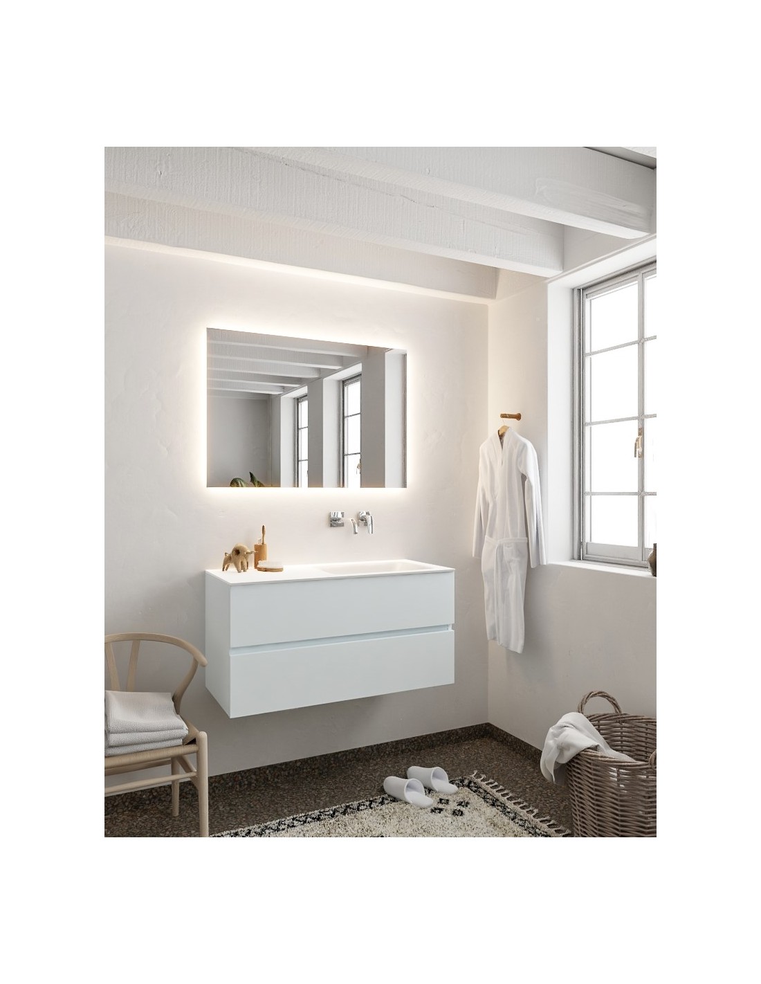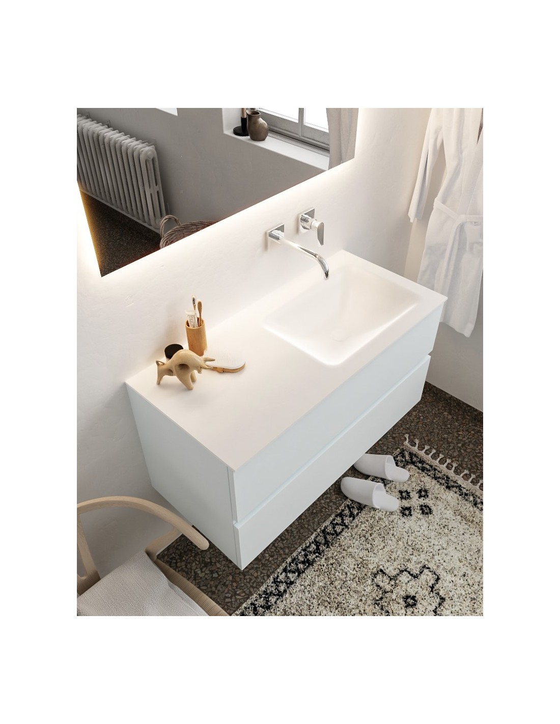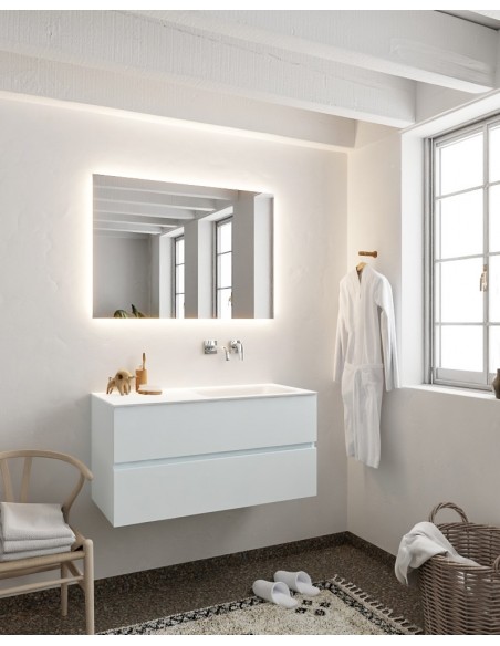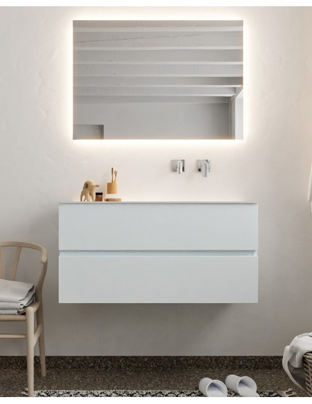 VICA Komplet badmiljø med højrevendt håndvask til vægmonteret armatur. Badmiljøet kommer med 2 skuffer med fuldt udtræk, og er fremstillet i MDF. Håndvasken er fremstillet i talkum farvet (mat hvid) solid surface. Badmiljøet måler 100 cm i bredden. Det viste armatur medfølger ikke i sættet.
