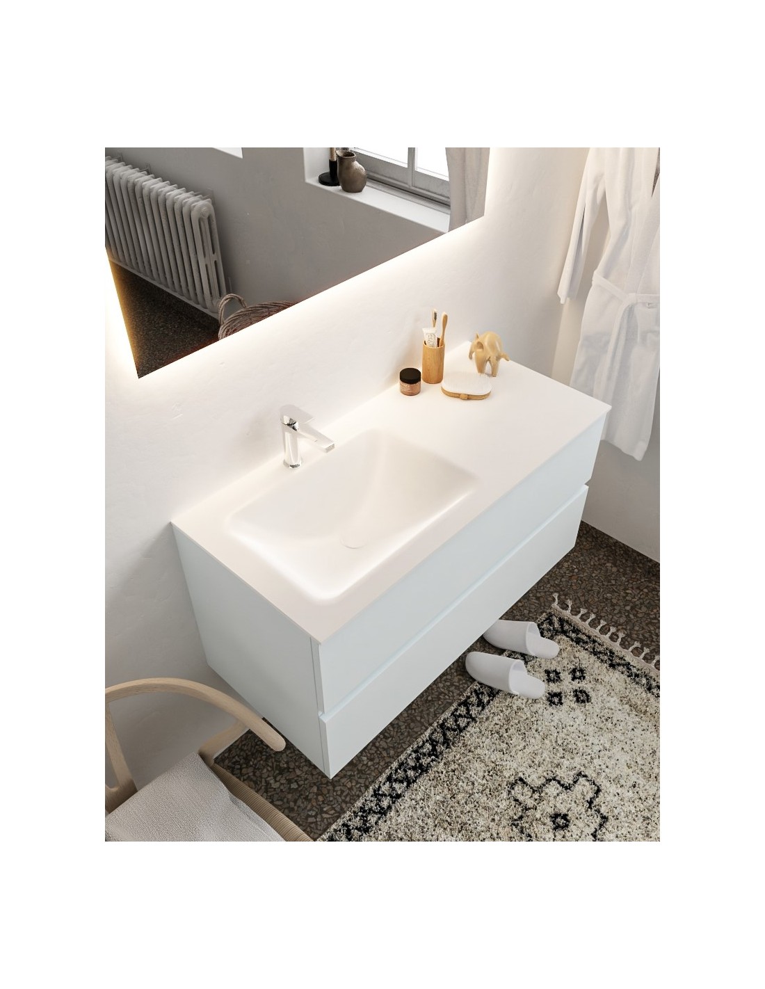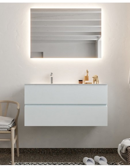 VICA Komplet badmiljø med venstrevendt håndvask til bordmonteret armatur. Badmiljøet kommer med 2 skuffer med fuldt udtræk, og er fremstillet i MDF. Håndvasken er fremstillet i talkum farvet (mat hvid) solid surface. Badmiljøet måler 100 cm i bredden. Det viste armatur medfølger ikke i sættet.