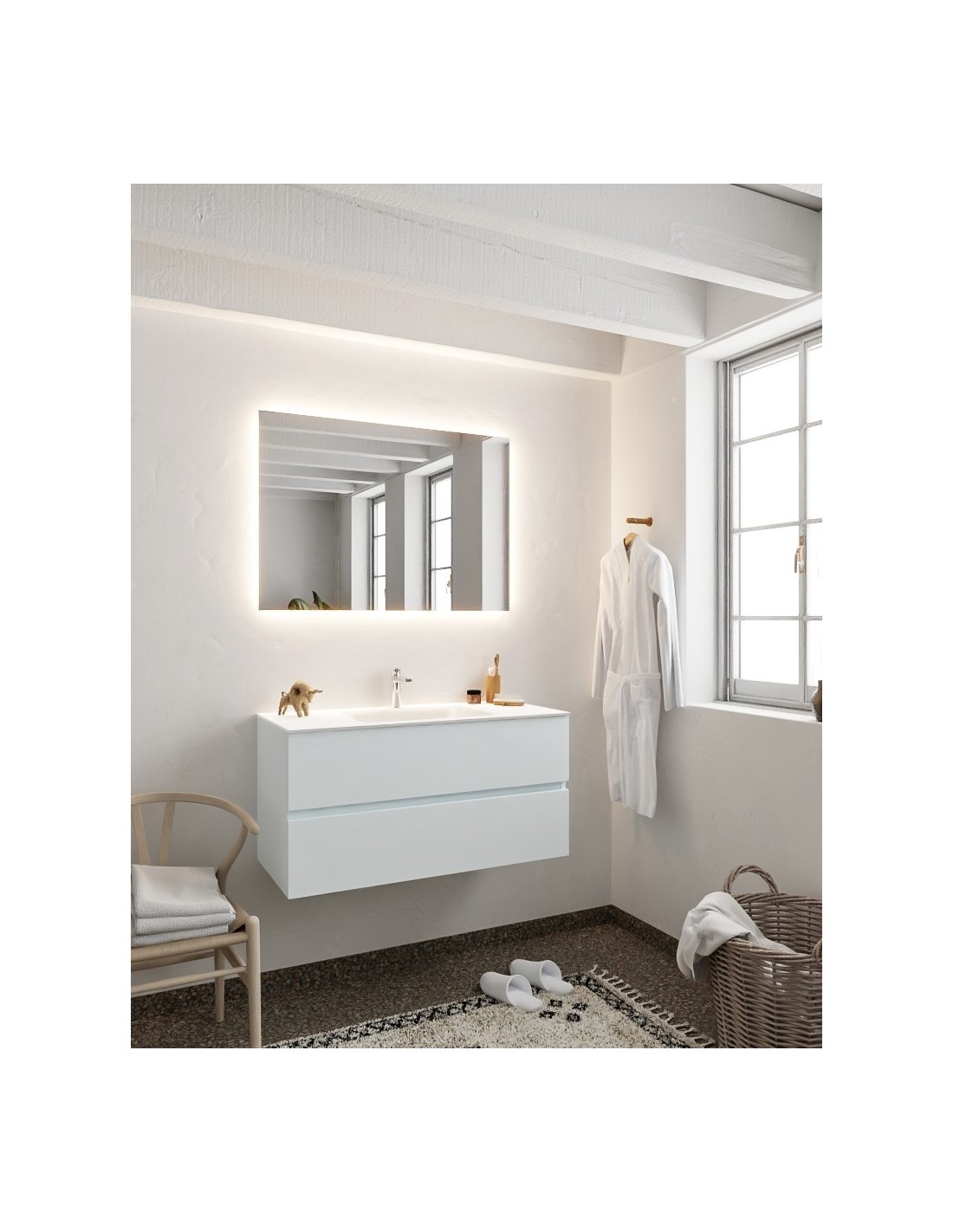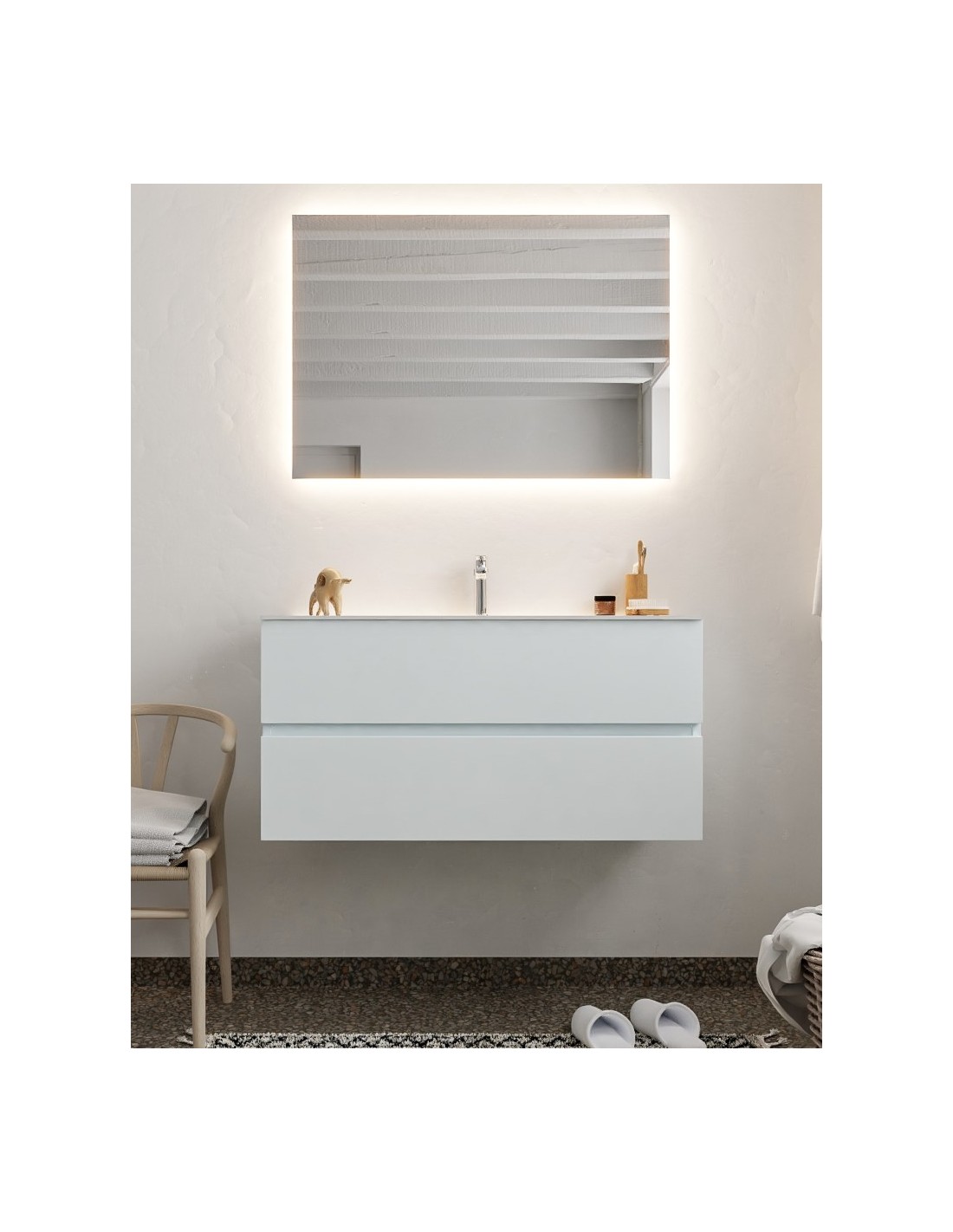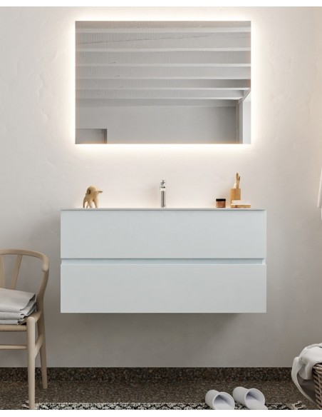 VICA Komplet badmiljø med midt centreret håndvask til bordmonteret armatur. Badmiljøet kommer med 2 skuffer med fuldt udtræk, og er fremstillet i MDF. Håndvasken er fremstillet i talkum farvet (mat hvid) solid surface. Badmiljøet måler 100 cm i bredden. Det viste armatur medfølger ikke i sættet.