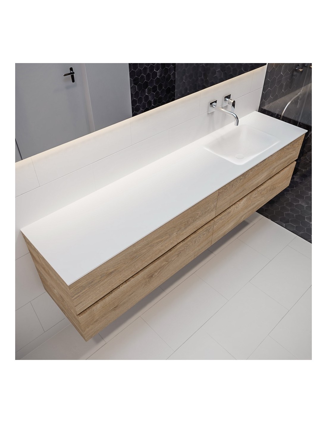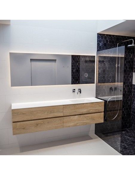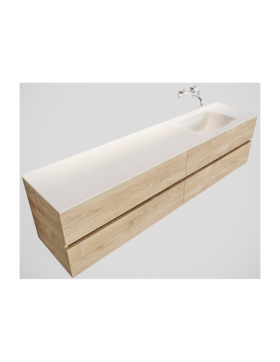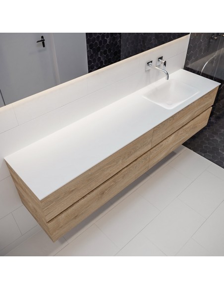 VICA Komplet badmiljø med højrevendt håndvask til vægmonteret armatur. Badmiljøet kommer med 4 skuffer med fuldt udtræk, og er fremstillet i MDF med design af vasket eg. Håndvasken er fremstillet i talkum farvet (mat hvid) solid surface. Badmiljøet måler 200 cm i bredden. Det viste armatur medfølger ikke i sættet.