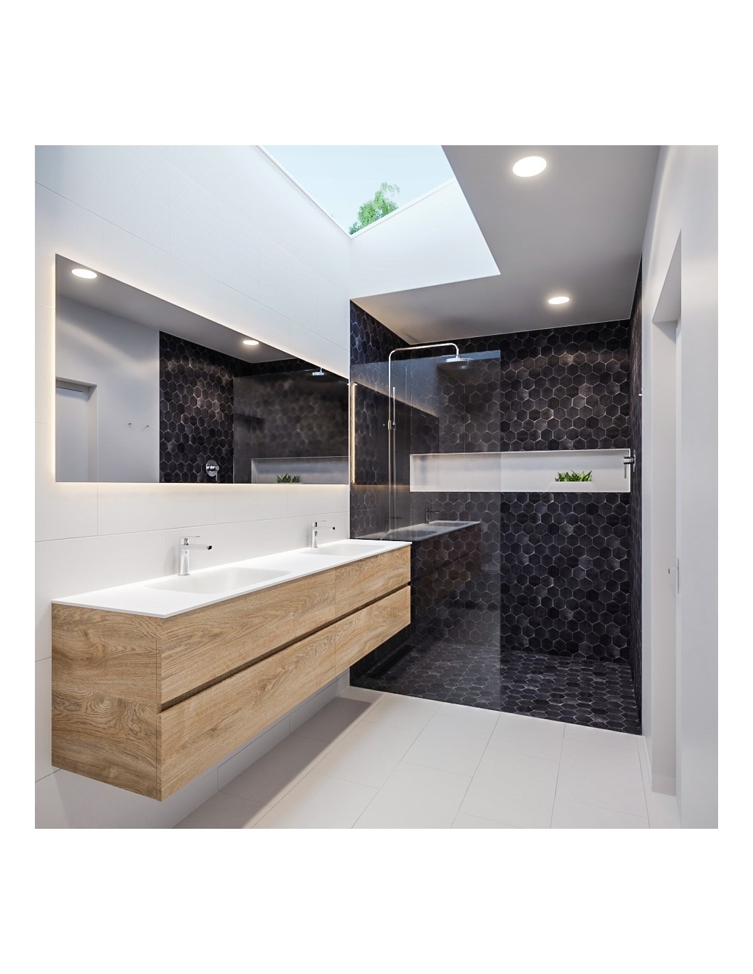 VICA Komplet badmiljø med dobbelt håndvask til bordmonterede armaturer. Badmiljøet kommer med 4 skuffer med fuldt udtræk, og er fremstillet i MDF med design af vasket eg. Håndvasken er fremstillet i talkum farvet (mat hvid) solid surface. Badmiljøet måler 200 cm i bredden. Det viste armatur medfølger ikke i sættet.