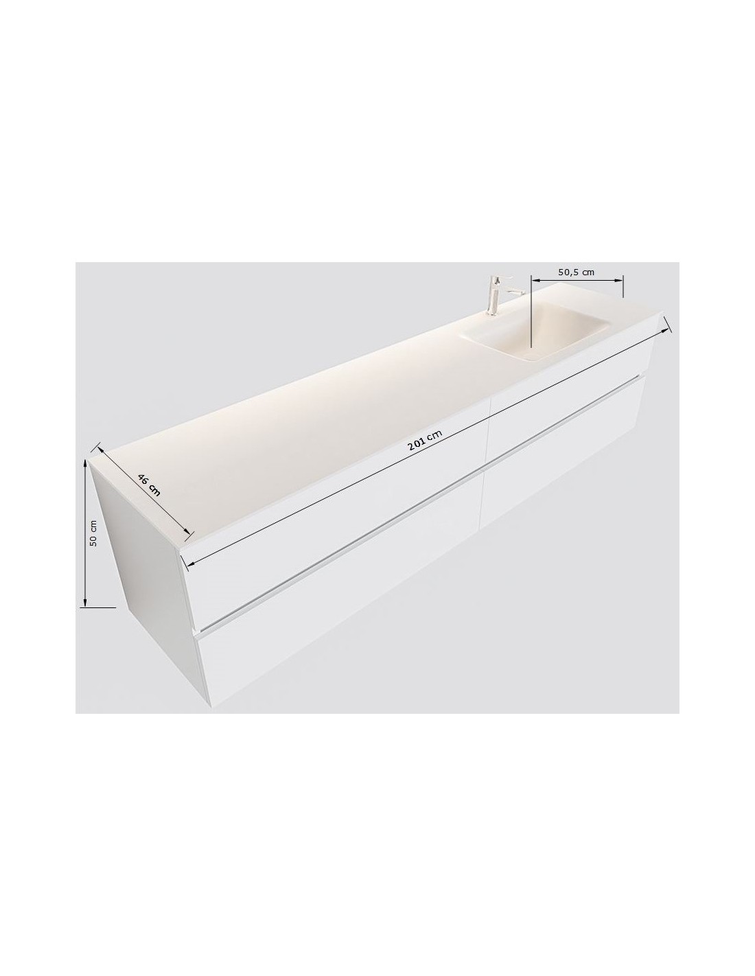 VICA Komplet badmiljø med højrevendt håndvask til bordmonteret armatur. Badmiljøet kommer med 4 skuffer med fuldt udtræk, og er fremstillet i MDF. Håndvasken er fremstillet i talkum farvet (mat hvid) solid surface. Badmiljøet måler 200 cm i bredden. Det viste armatur medfølger ikke i sættet.