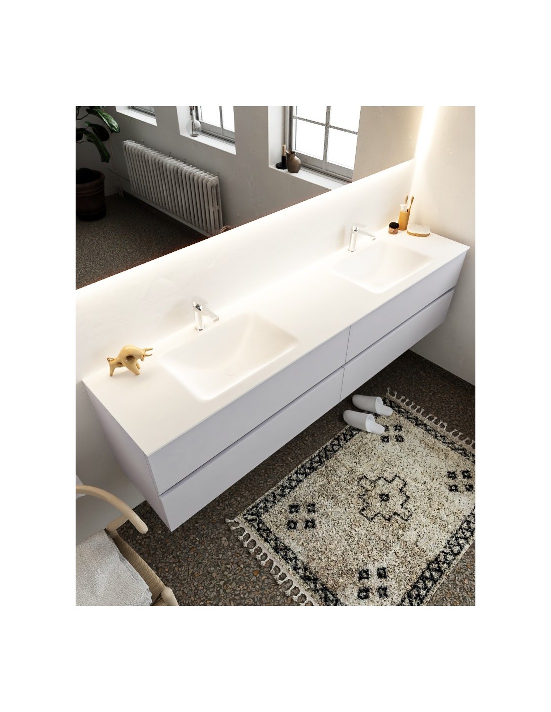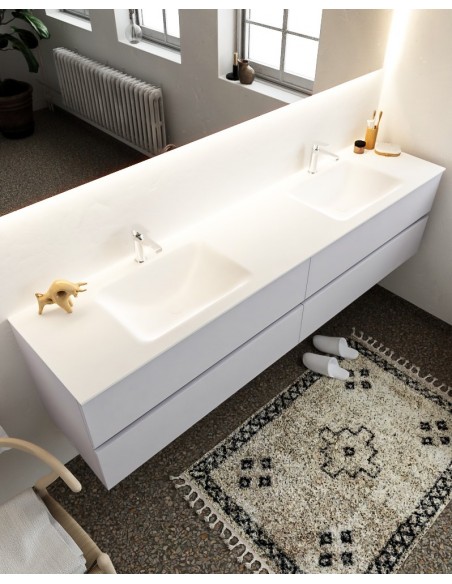 VICA Komplet badmiljø med dobbelt håndvask til bordmonterede armaturer. Badmiljøet kommer med 4 skuffer med fuldt udtræk, og er fremstillet i MDF. Håndvasken er fremstillet i talkum farvet (mat hvid) solid surface. Badmiljøet måler 200 cm i bredden. Det viste armatur medfølger ikke i sættet.
