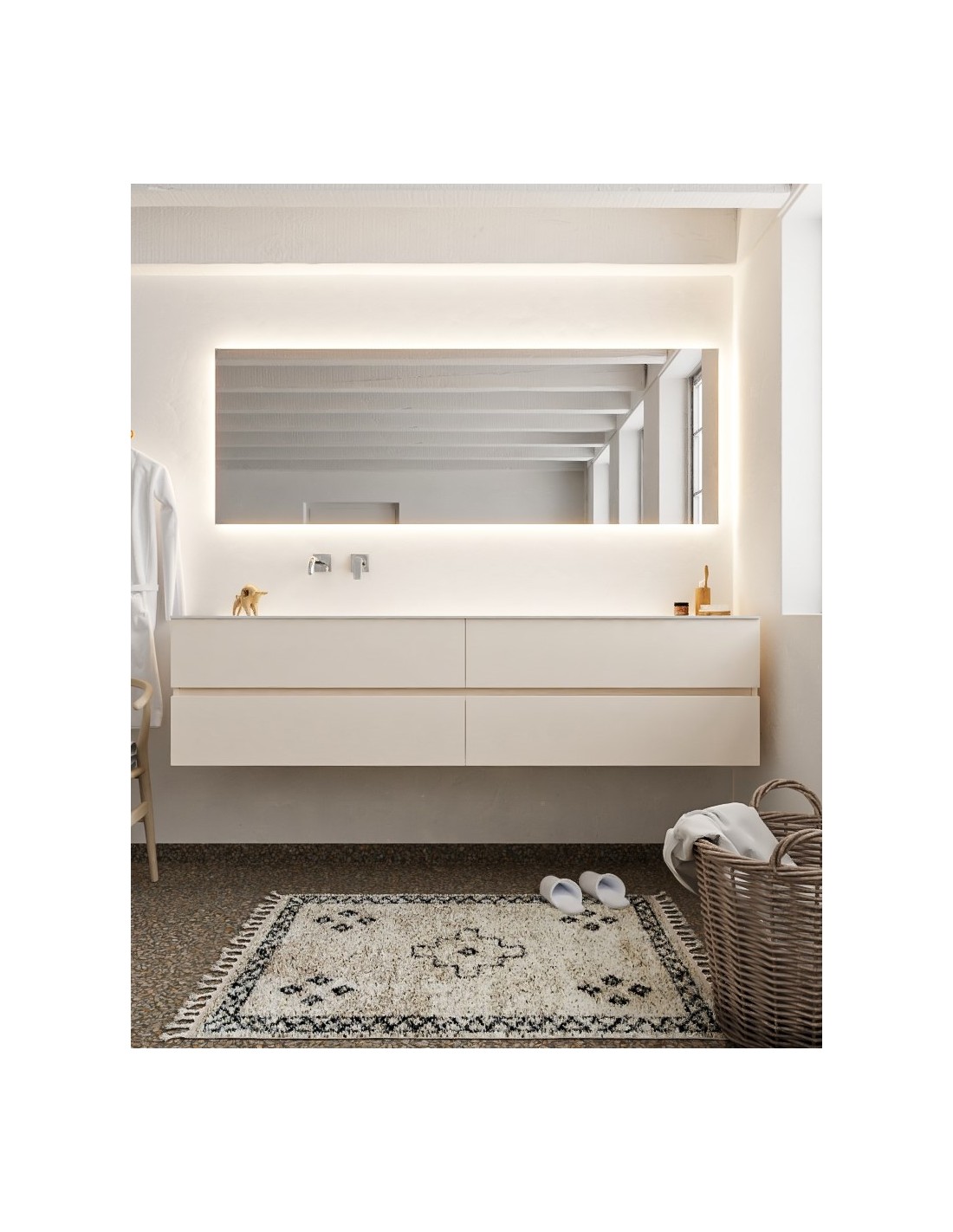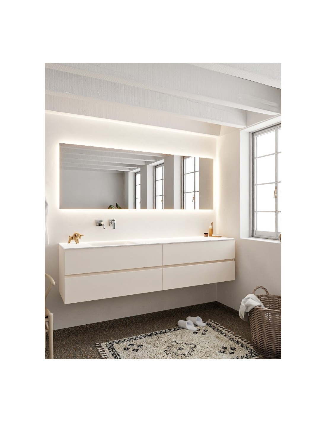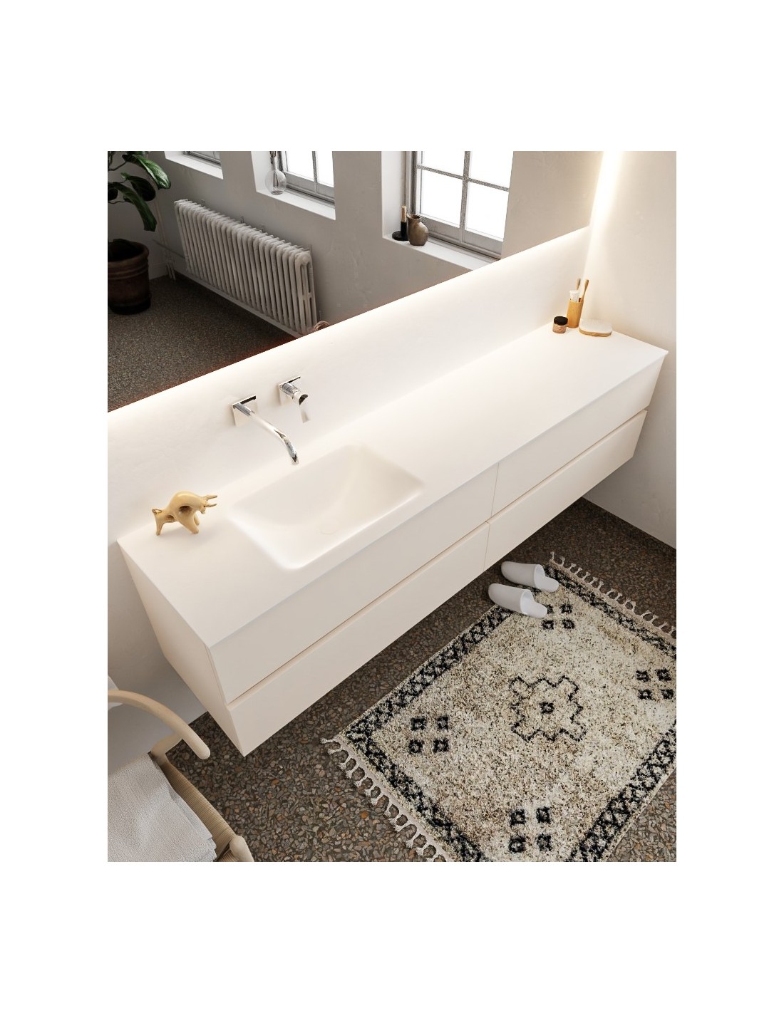 VICA Komplet badmiljø med venstrevendt håndvask til vægmonteret armatur. Badmiljøet kommer med 4 skuffer med fuldt udtræk, og er fremstillet i MDF. Håndvasken er fremstillet i talkum farvet (mat hvid) solid surface. Badmiljøet måler 200 cm i bredden. Det viste armatur medfølger ikke i sættet.