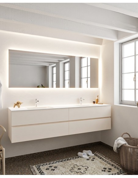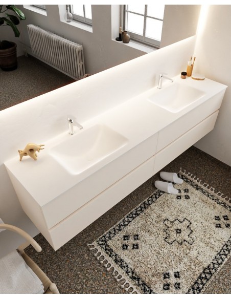 VICA Komplet badmiljø med dobbelt håndvask til bordmonterede armaturer. Badmiljøet kommer med 4 skuffer med fuldt udtræk, og er fremstillet i MDF. Håndvasken er fremstillet i talkum farvet (mat hvid) solid surface. Badmiljøet måler 200 cm i bredden. Det viste armatur medfølger ikke i sættet.