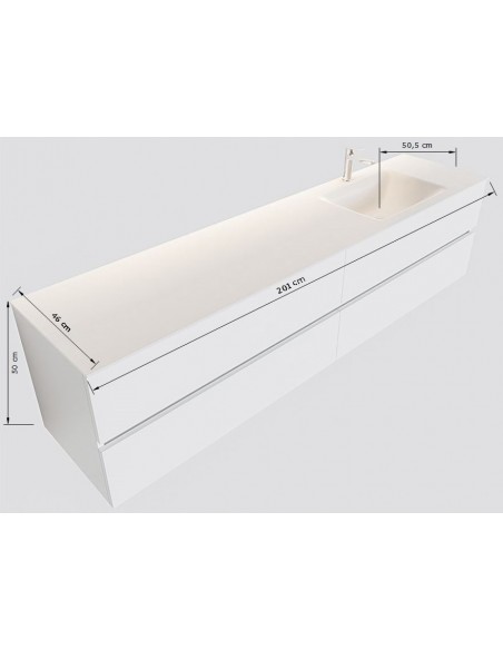 VICA Komplet badmiljø med højrevendt håndvask til bordmonteret armatur. Badmiljøet kommer med 4 skuffer med fuldt udtræk, og er fremstillet i MDF. Håndvasken er fremstillet i talkum farvet (mat hvid) solid surface. Badmiljøet måler 200 cm i bredden. Det viste armatur medfølger ikke i sættet.