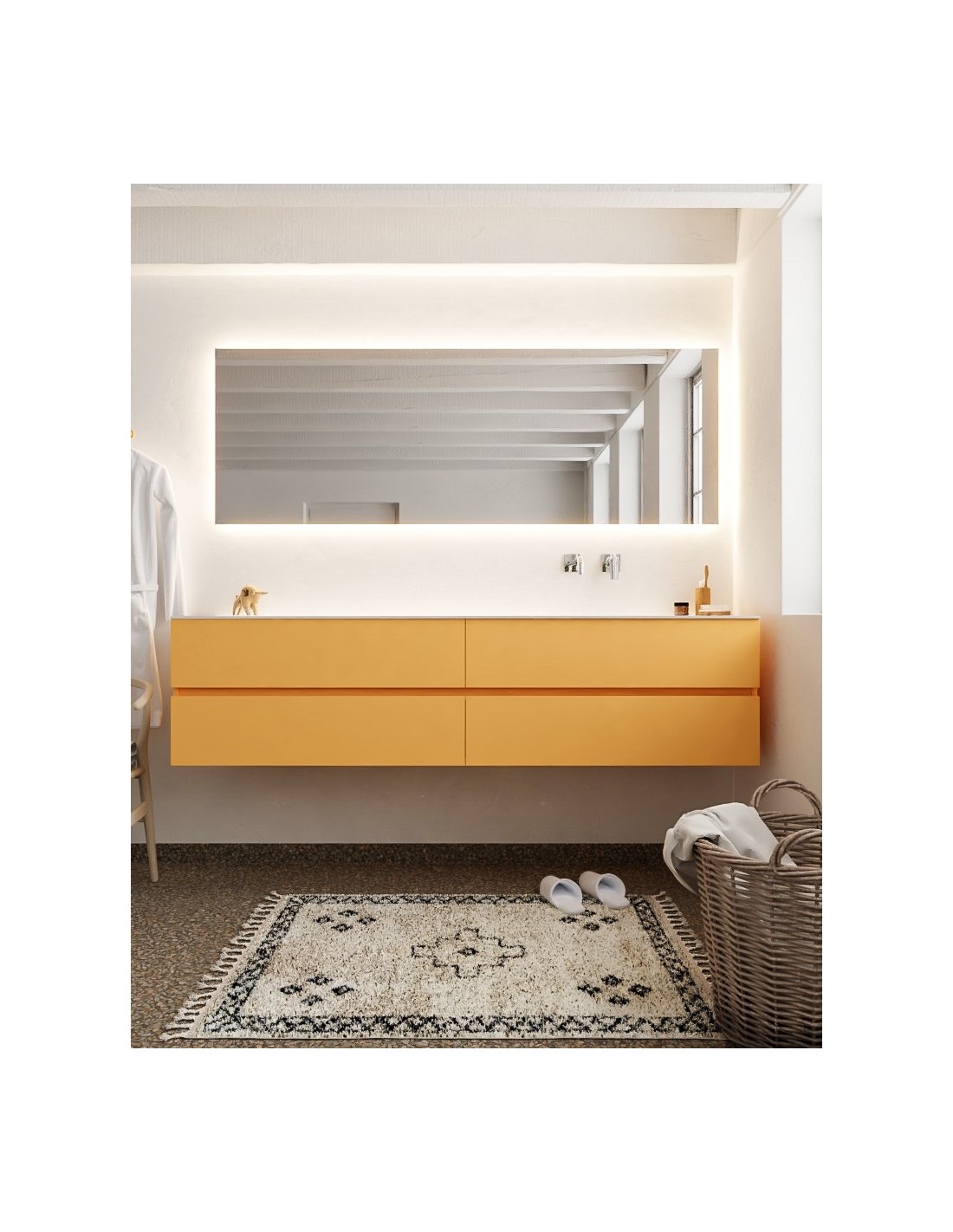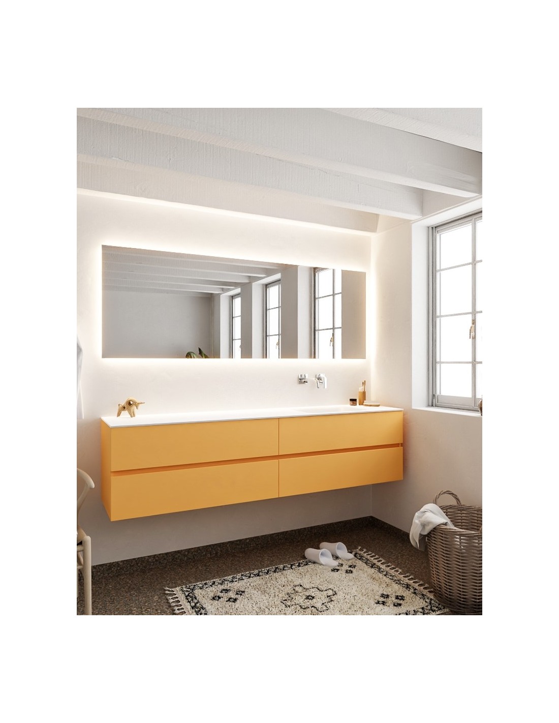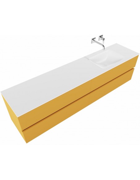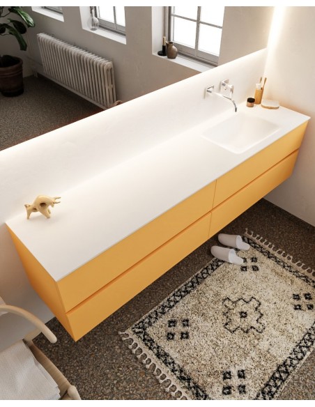 VICA Komplet badmiljø med højrevendt håndvask til vægmonteret armatur. Badmiljøet kommer med 4 skuffer med fuldt udtræk, og er fremstillet i MDF. Håndvasken er fremstillet i talkum farvet (mat hvid) solid surface. Badmiljøet måler 200 cm i bredden. Det viste armatur medfølger ikke i sættet.