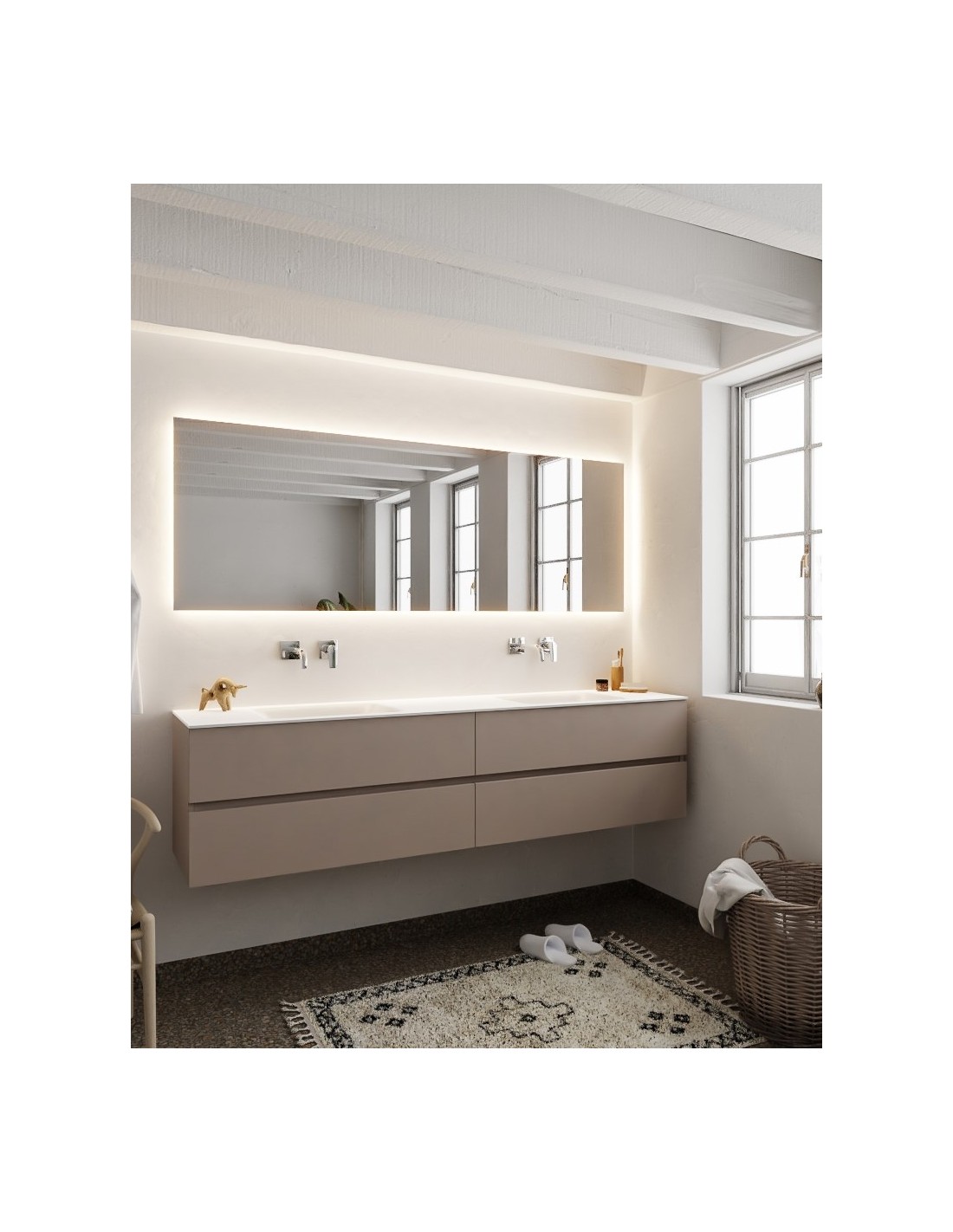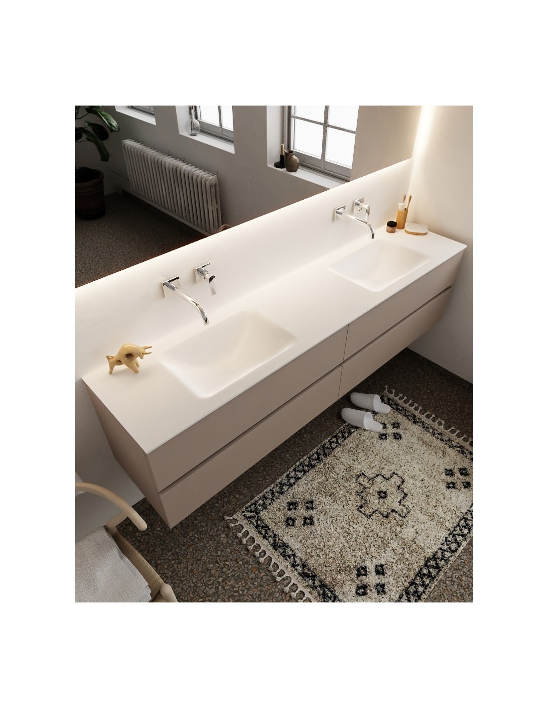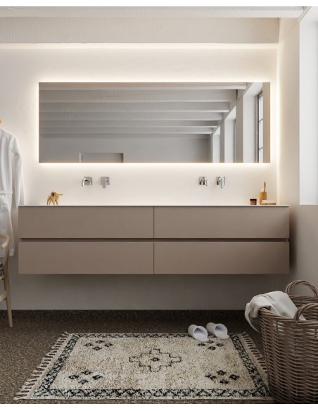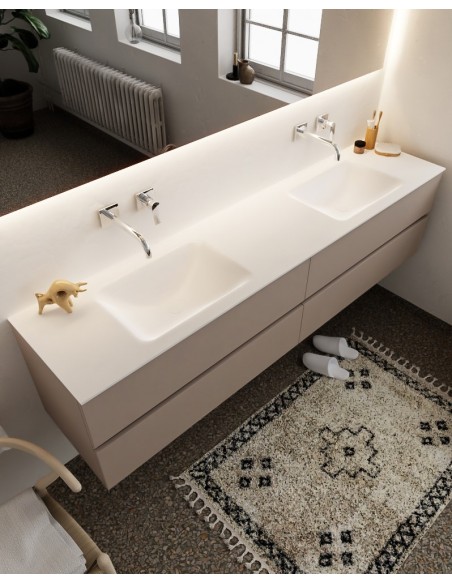 VICA Komplet badmiljø med dobbelt håndvask til vægmonterede armaturer. Badmiljøet kommer med 4 skuffer med fuldt udtræk, og er fremstillet i MDF. Håndvasken er fremstillet i talkum farvet (mat hvid) solid surface. Badmiljøet måler 200 cm i bredden. Det viste armatur medfølger ikke i sættet.