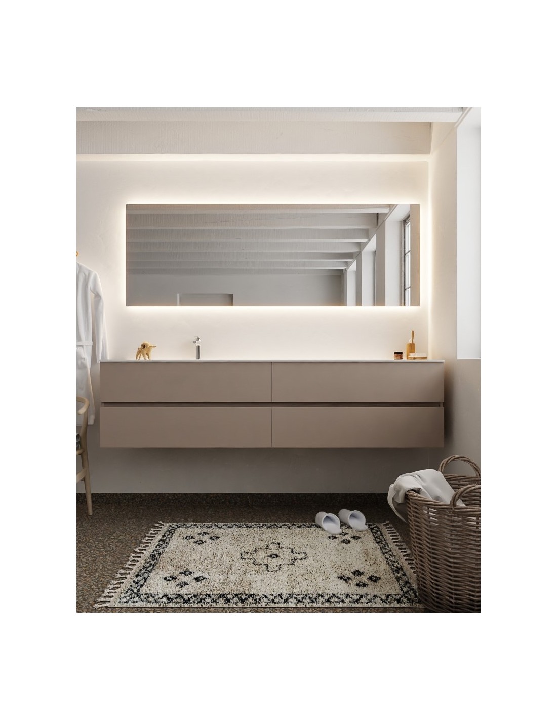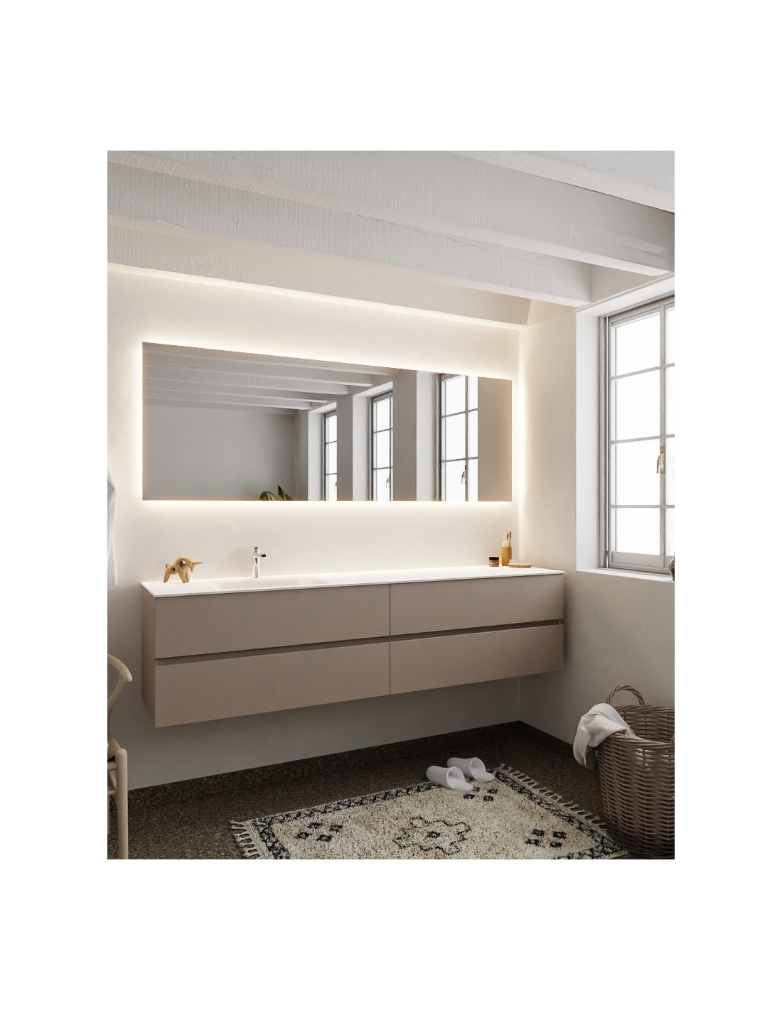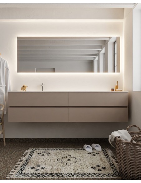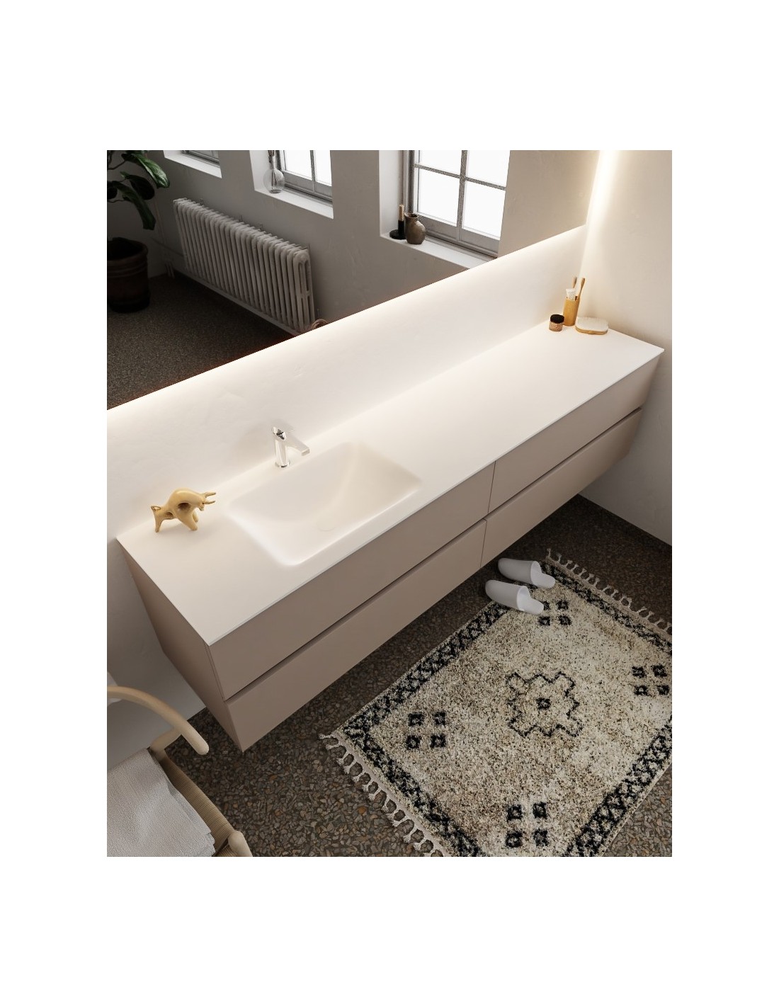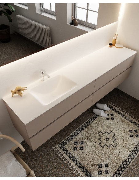 VICA Komplet badmiljø med venstrevendt håndvask til bordmonteret armatur. Badmiljøet kommer med 4 skuffer med fuldt udtræk, og er fremstillet i MDF. Håndvasken er fremstillet i talkum farvet (mat hvid) solid surface. Badmiljøet måler 200 cm i bredden. Det viste armatur medfølger ikke i sættet.