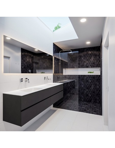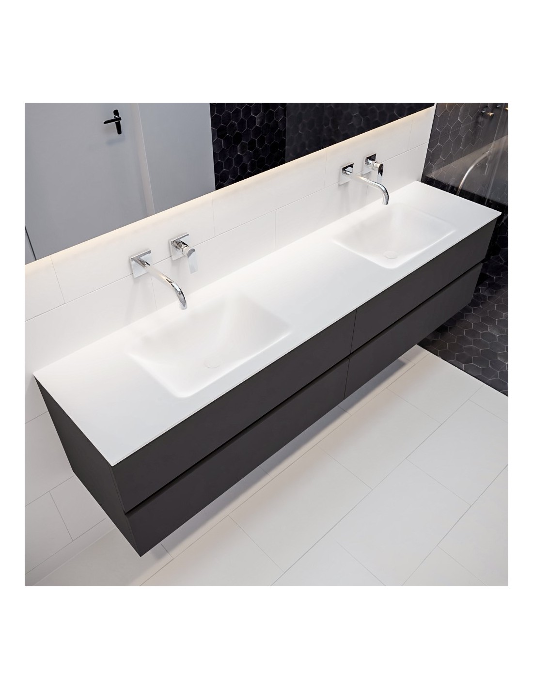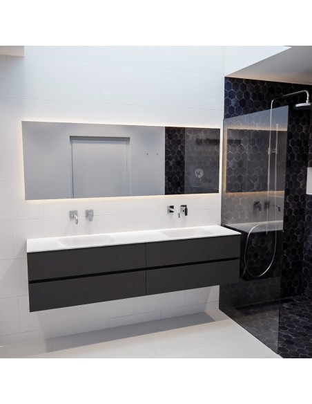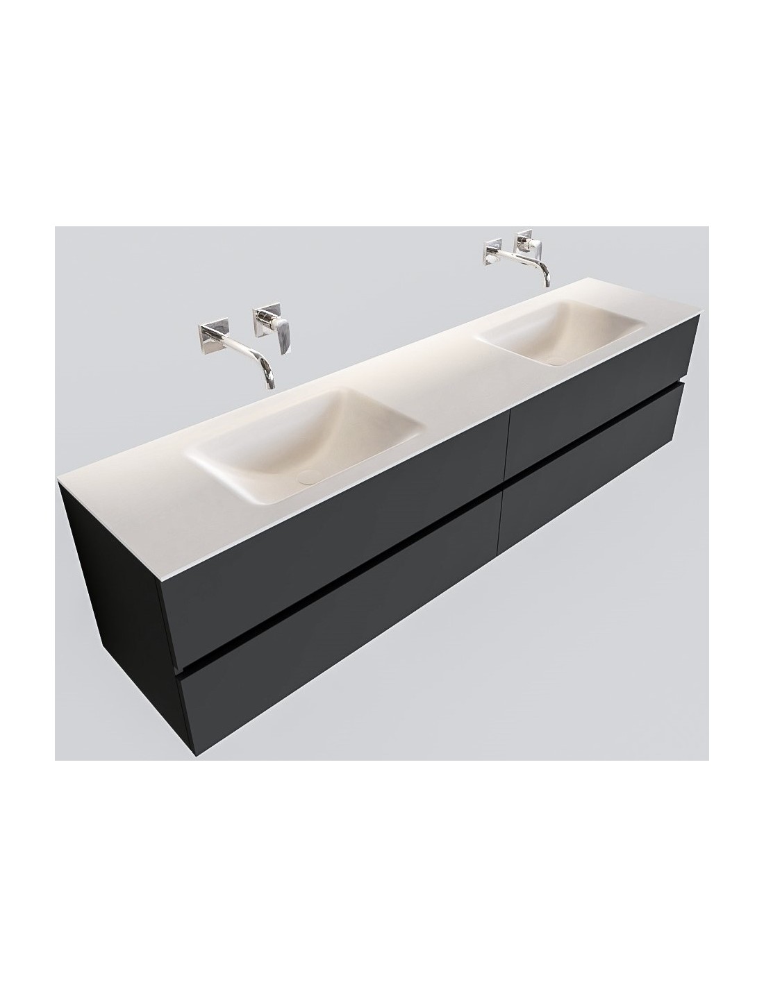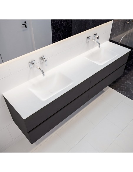 VICA Komplet badmiljø med dobbelt håndvask til vægmonterede armaturer. Badmiljøet kommer med 4 skuffer med fuldt udtræk, og er fremstillet i MDF. Håndvasken er fremstillet i talkum farvet (mat hvid) solid surface. Badmiljøet måler 200 cm i bredden. Det viste armatur medfølger ikke i sættet.