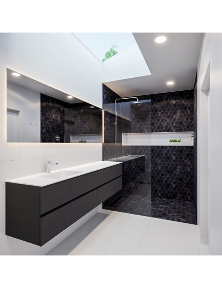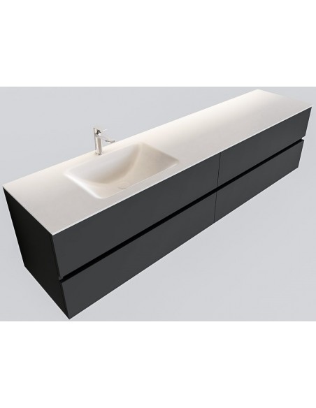 VICA Komplet badmiljø med venstrevendt håndvask til bordmonteret armatur. Badmiljøet kommer med 4 skuffer med fuldt udtræk, og er fremstillet i MDF. Håndvasken er fremstillet i talkum farvet (mat hvid) solid surface. Badmiljøet måler 200 cm i bredden. Det viste armatur medfølger ikke i sættet.