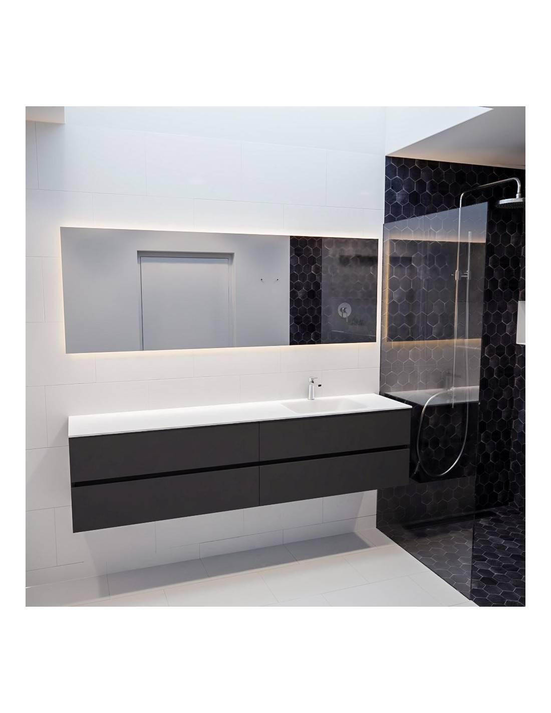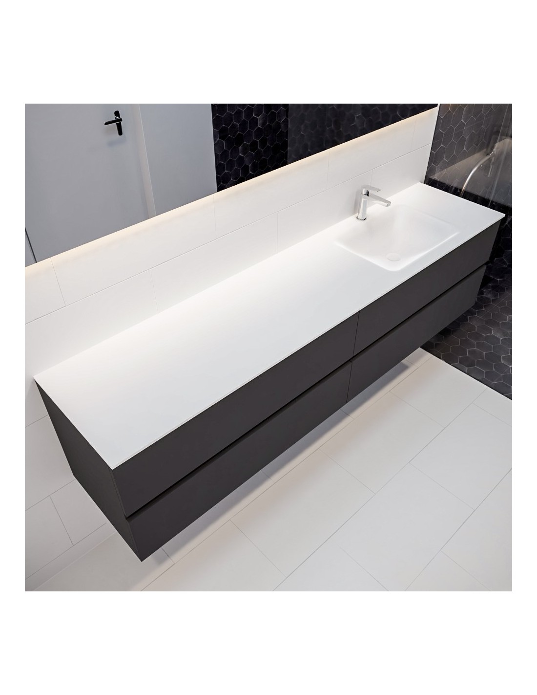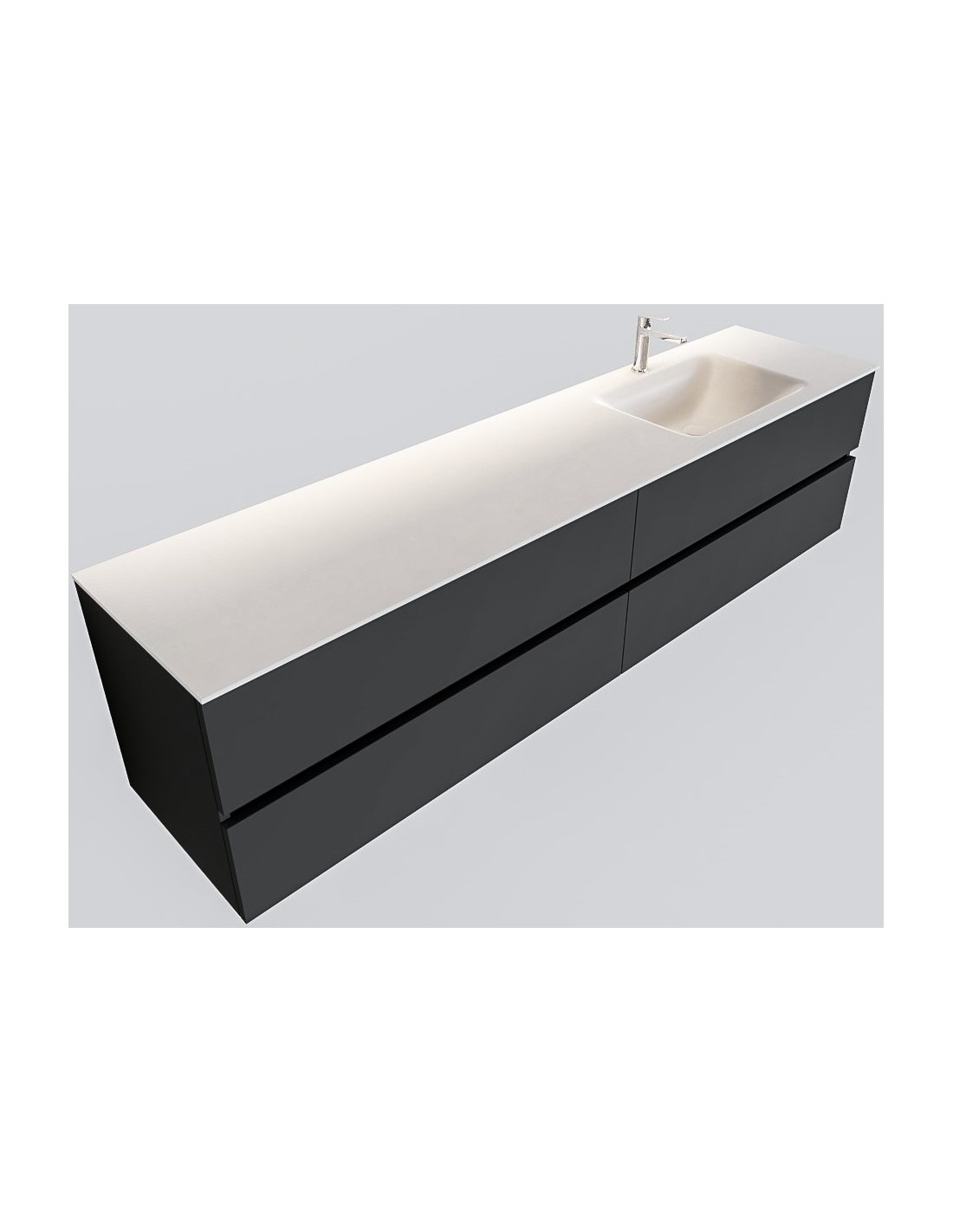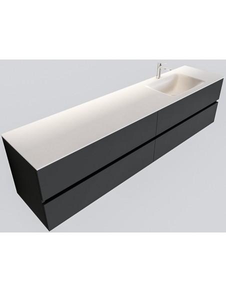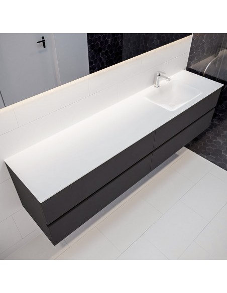 VICA Komplet badmiljø med højrevendt håndvask til bordmonteret armatur. Badmiljøet kommer med 4 skuffer med fuldt udtræk, og er fremstillet i MDF. Håndvasken er fremstillet i talkum farvet (mat hvid) solid surface. Badmiljøet måler 200 cm i bredden. Det viste armatur medfølger ikke i sættet.