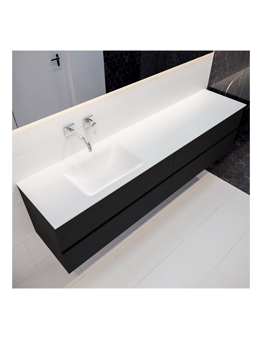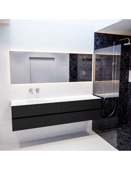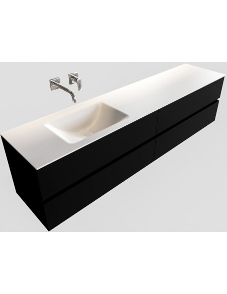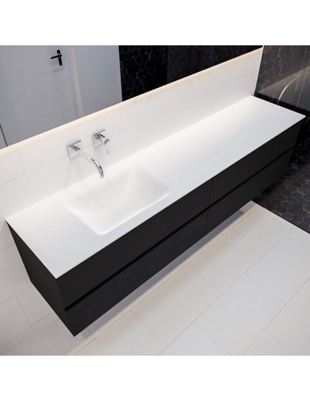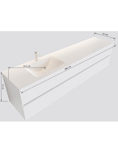 VICA Komplet badmiljø med venstrevendt håndvask til vægmonteret armatur. Badmiljøet kommer med 4 skuffer med fuldt udtræk, og er fremstillet i MDF. Håndvasken er fremstillet i talkum farvet (mat hvid) solid surface. Badmiljøet måler 200 cm i bredden. Det viste armatur medfølger ikke i sættet.