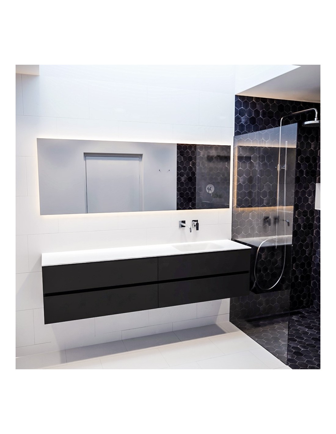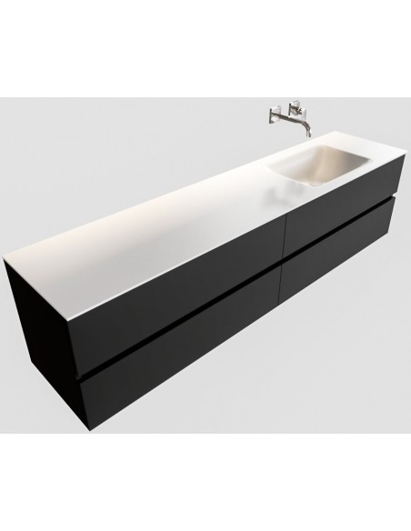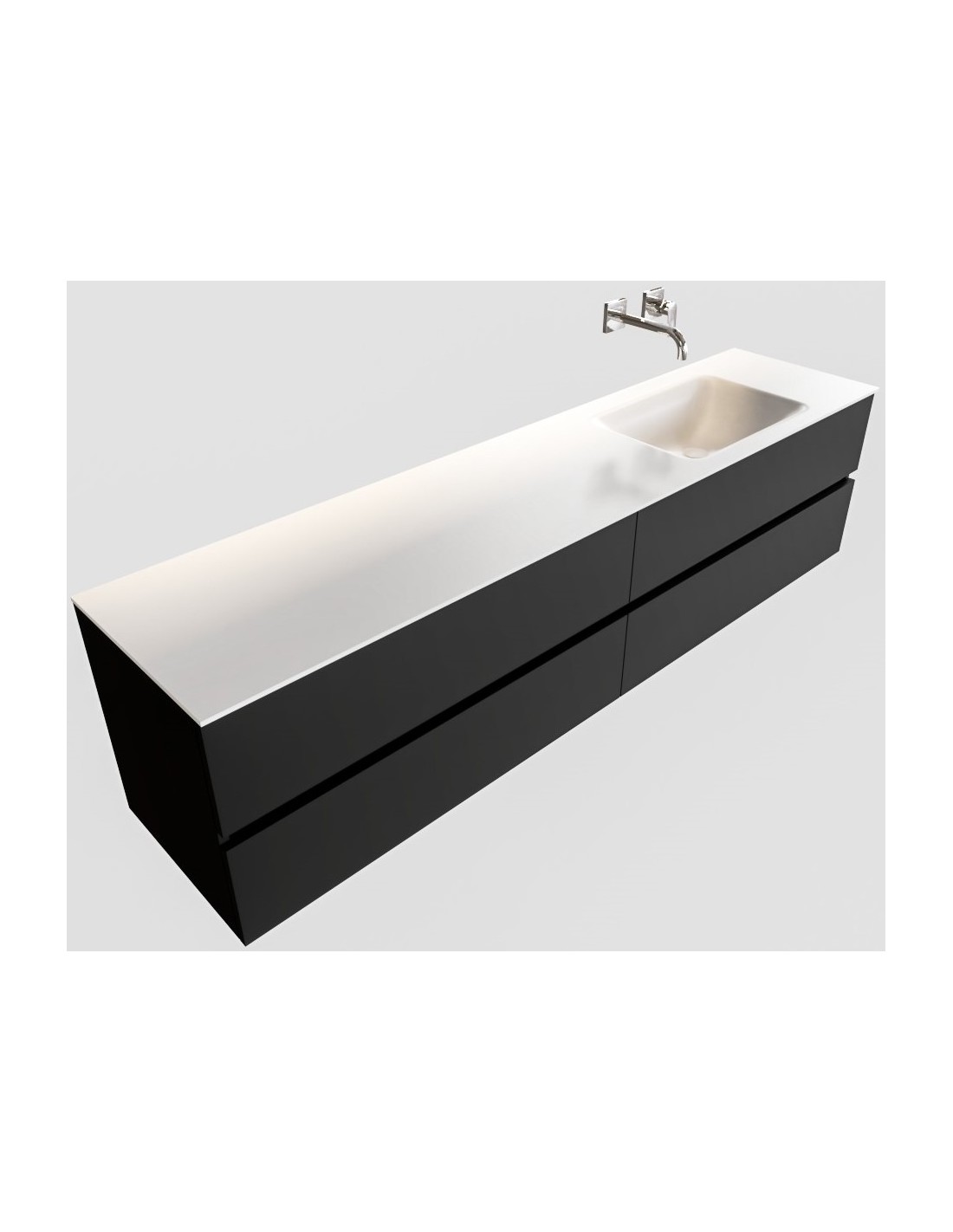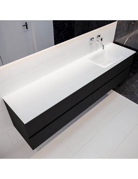 VICA Komplet badmiljø med højrevendt håndvask til vægmonteret armatur. Badmiljøet kommer med 4 skuffer med fuldt udtræk, og er fremstillet i MDF. Håndvasken er fremstillet i talkum farvet (mat hvid) solid surface. Badmiljøet måler 200 cm i bredden. Det viste armatur medfølger ikke i sættet.