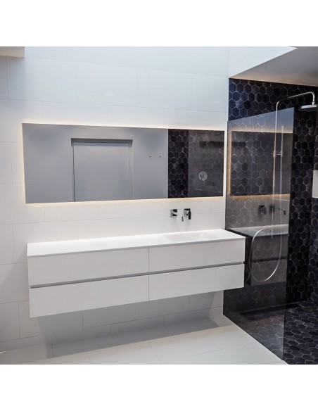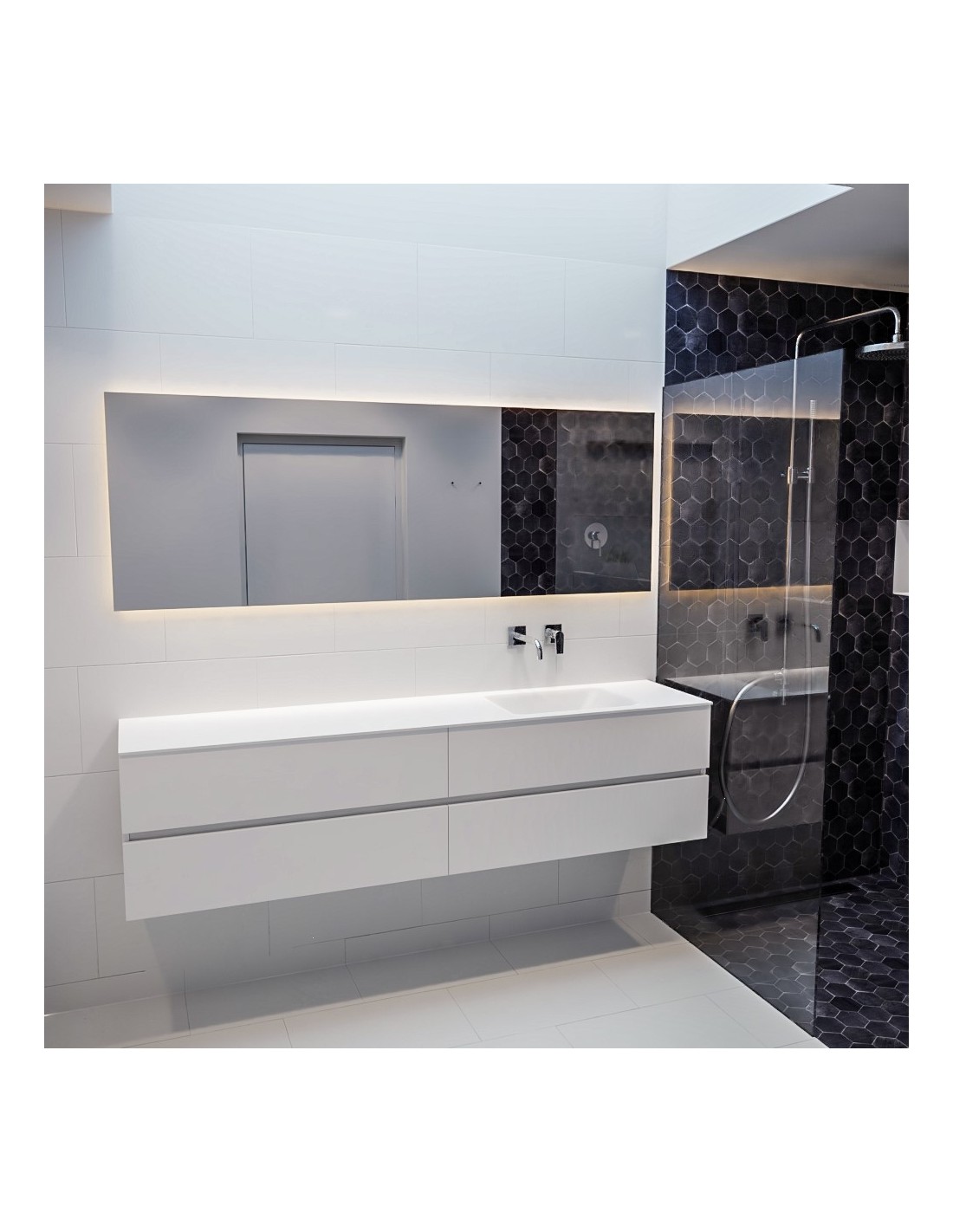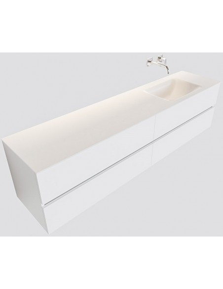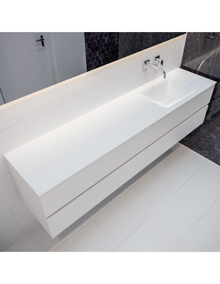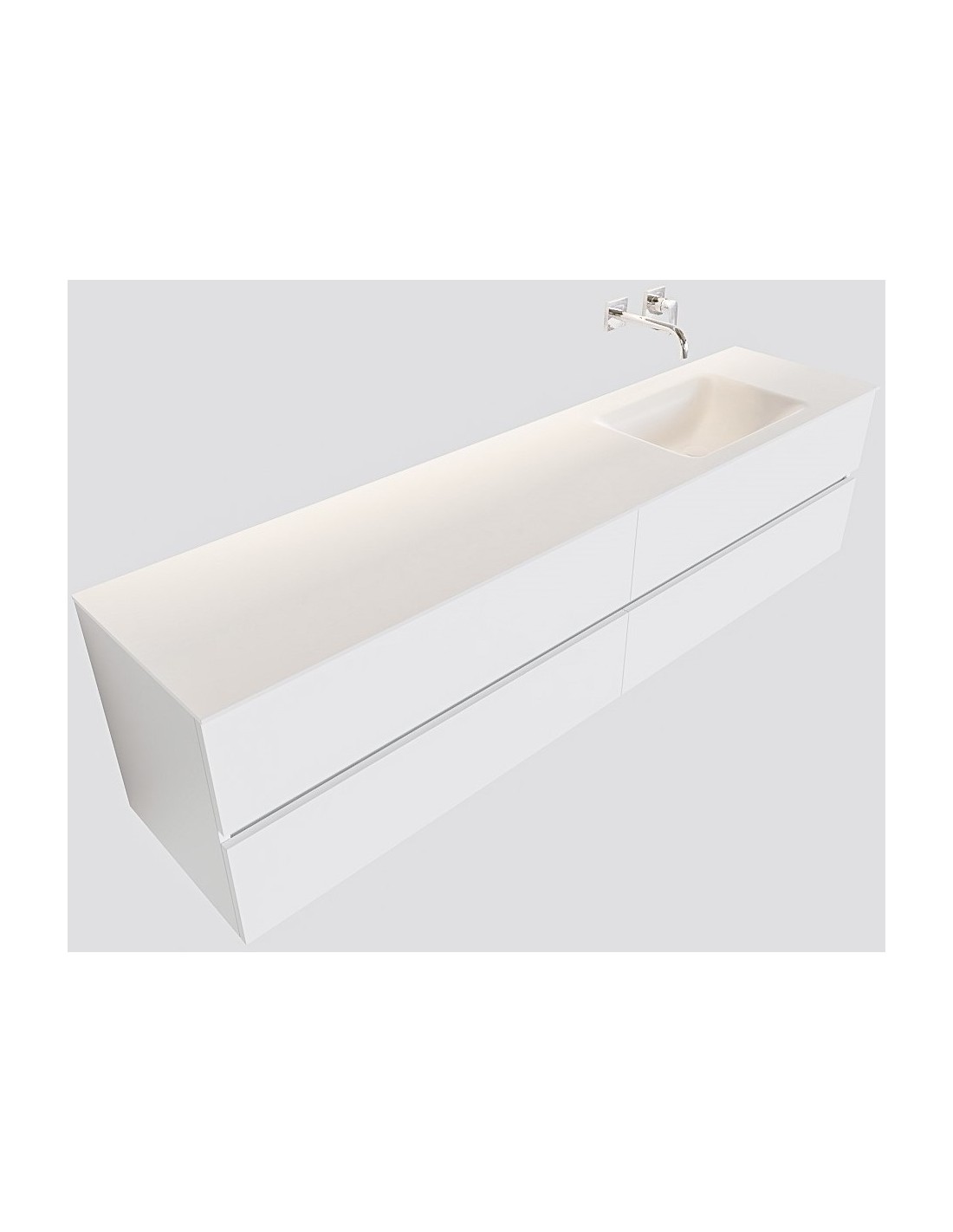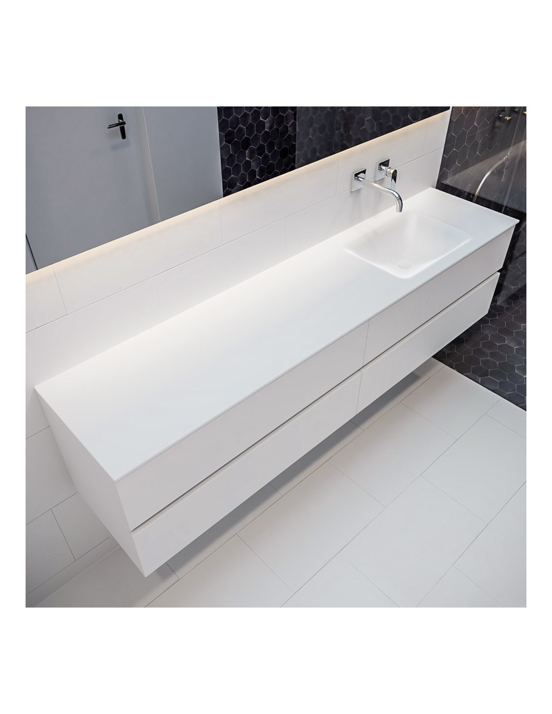 VICA Komplet badmiljø med højrevendt håndvask til vægmonteret armatur. Badmiljøet kommer med 4 skuffer med fuldt udtræk, og er fremstillet i MDF. Håndvasken er fremstillet i talkum farvet (mat hvid) solid surface. Badmiljøet måler 200 cm i bredden. Det viste armatur medfølger ikke i sættet.