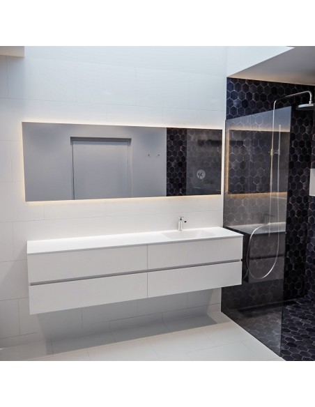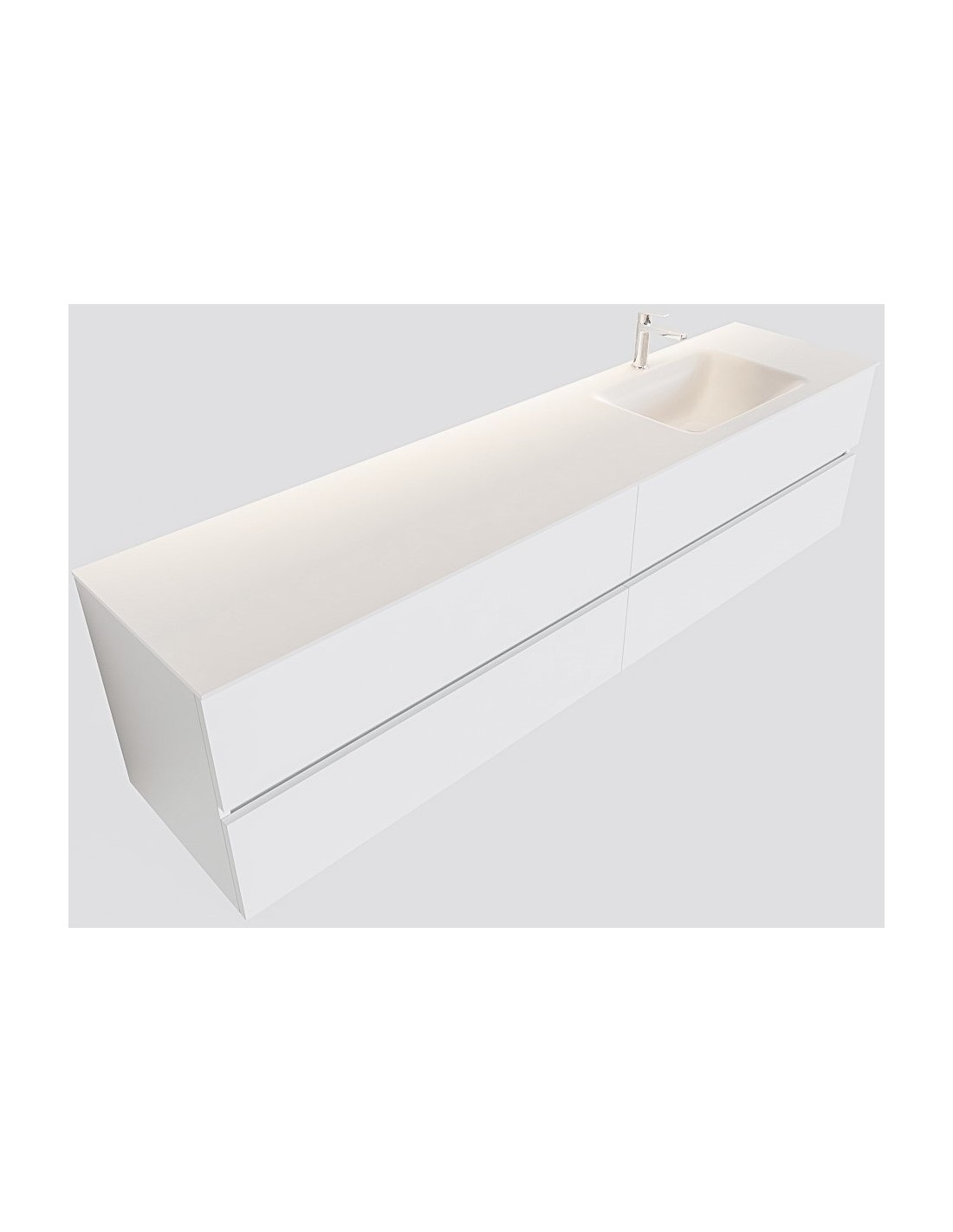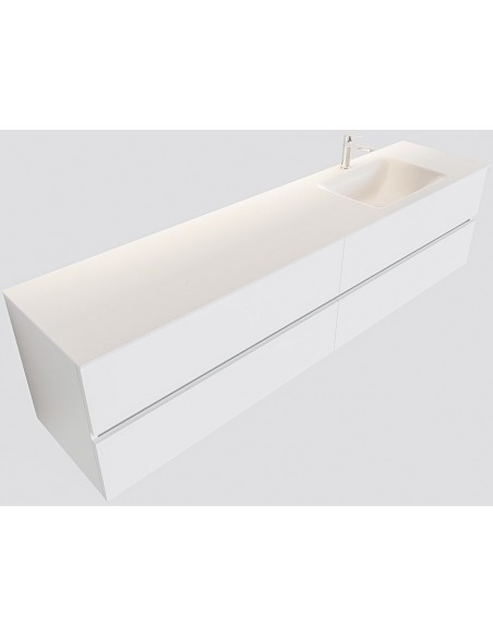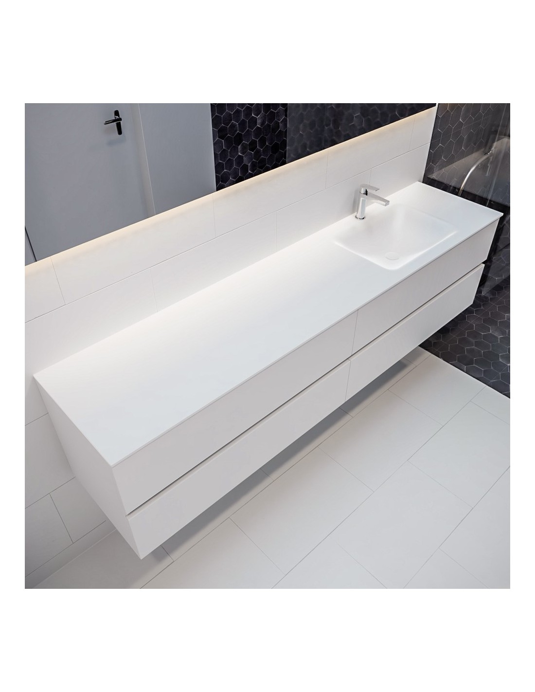 VICA Komplet badmiljø med højrevendt håndvask til bordmonteret armatur. Badmiljøet kommer med 4 skuffer med fuldt udtræk, og er fremstillet i MDF. Håndvasken er fremstillet i talkum farvet (mat hvid) solid surface. Badmiljøet måler 200 cm i bredden. Det viste armatur medfølger ikke i sættet.