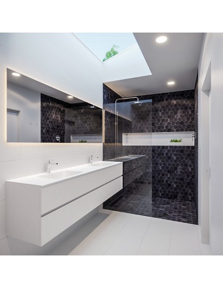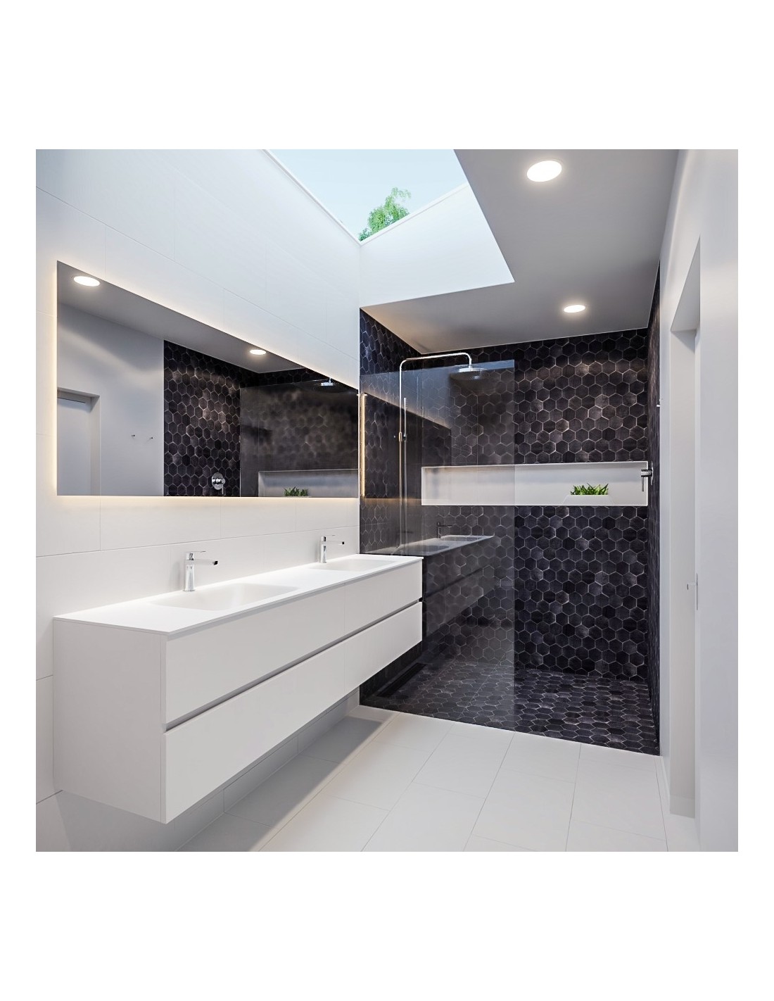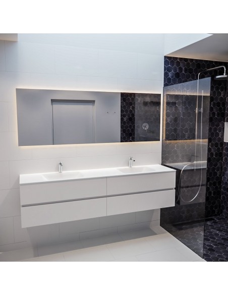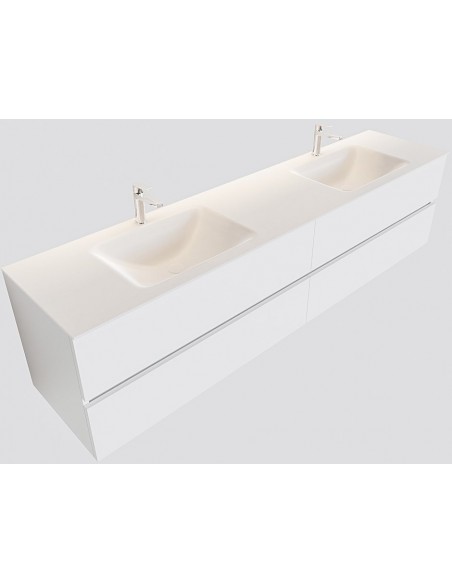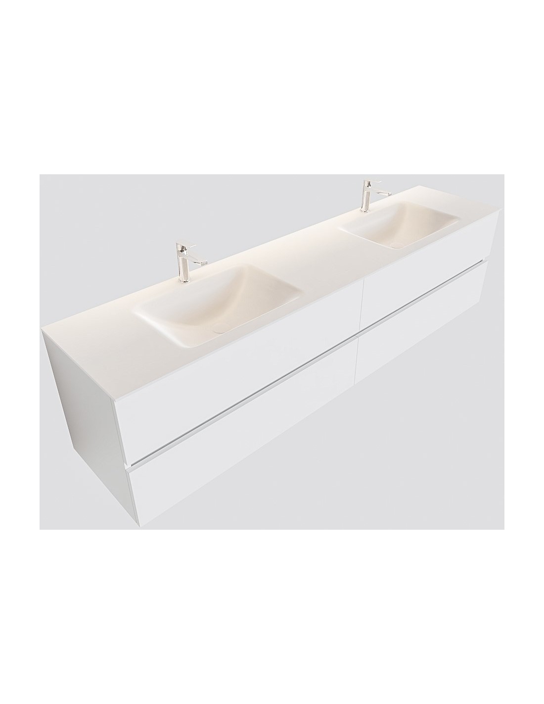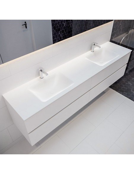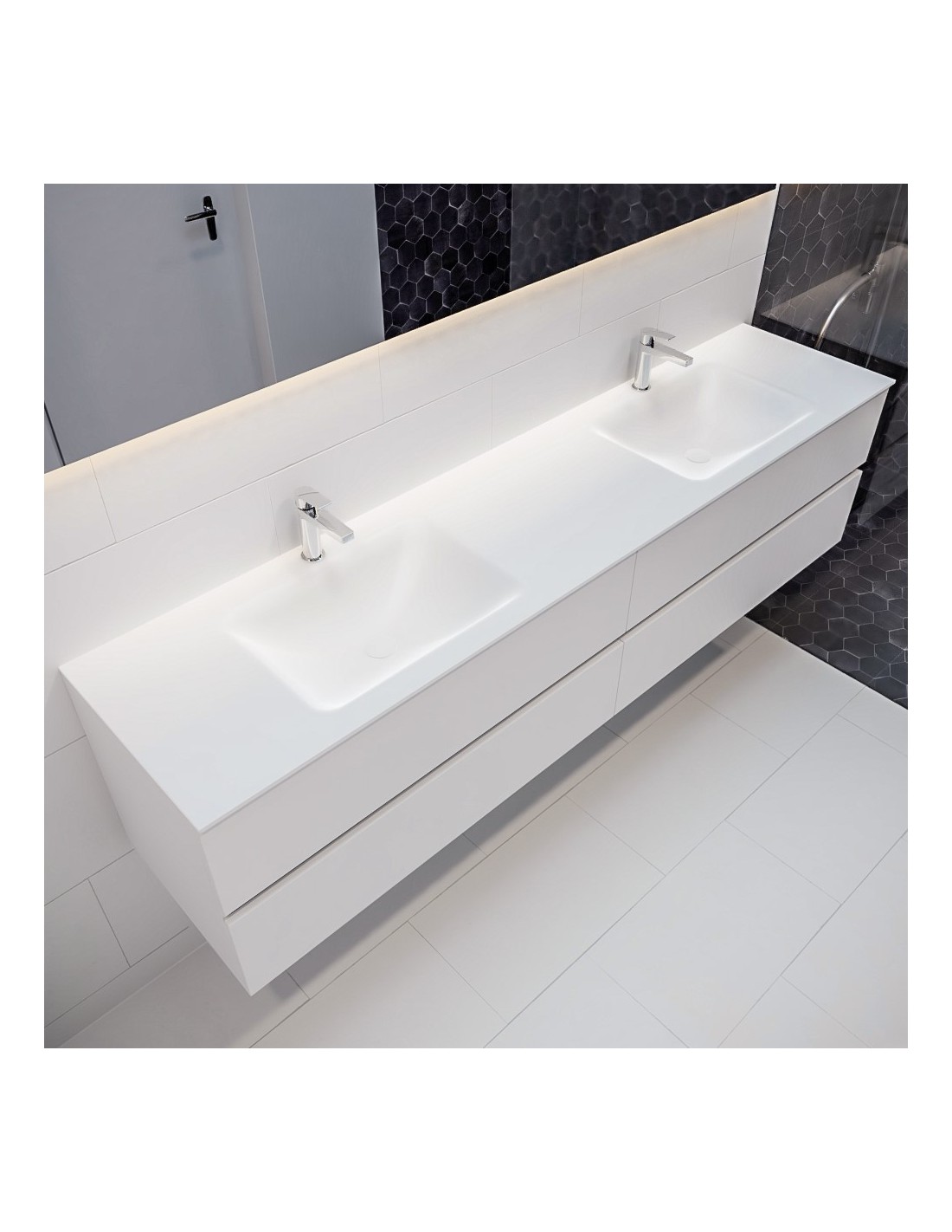 VICA Komplet badmiljø med dobbelt håndvask til bordmonterede armaturer. Badmiljøet kommer med 4 skuffer med fuldt udtræk, og er fremstillet i MDF. Håndvasken er fremstillet i talkum farvet (mat hvid) solid surface. Badmiljøet måler 200 cm i bredden. Det viste armatur medfølger ikke i sættet.