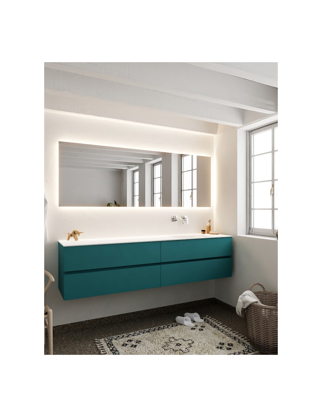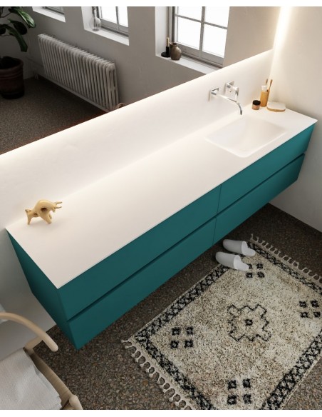 VICA Komplet badmiljø med højrevendt håndvask til vægmonteret armatur. Badmiljøet kommer med 4 skuffer med fuldt udtræk, og er fremstillet i MDF. Håndvasken er fremstillet i talkum farvet (mat hvid) solid surface. Badmiljøet måler 200 cm i bredden. Det viste armatur medfølger ikke i sættet.