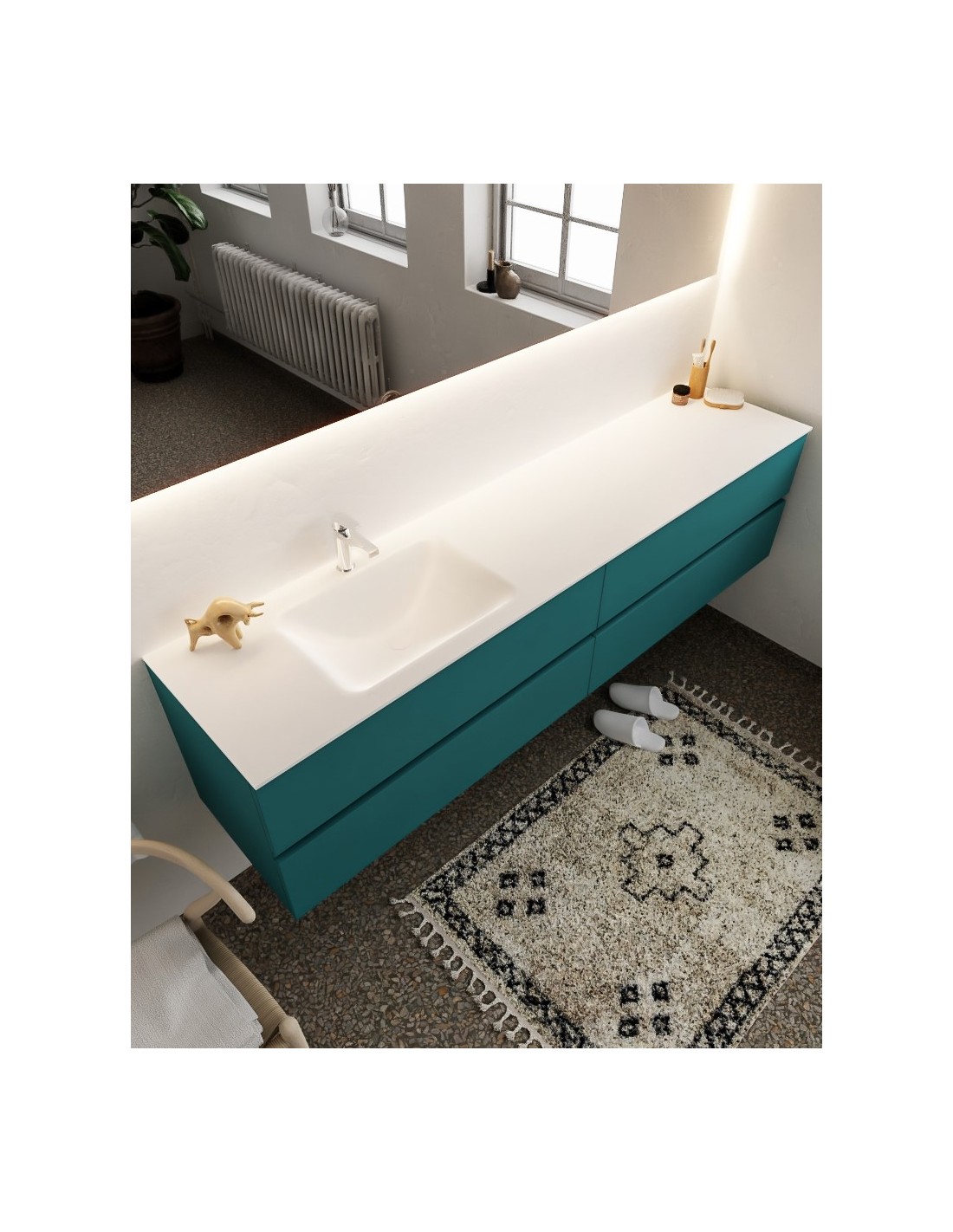 VICA Komplet badmiljø med venstrevendt håndvask til bordmonteret armatur. Badmiljøet kommer med 4 skuffer med fuldt udtræk, og er fremstillet i MDF. Håndvasken er fremstillet i talkum farvet (mat hvid) solid surface. Badmiljøet måler 200 cm i bredden. Det viste armatur medfølger ikke i sættet.