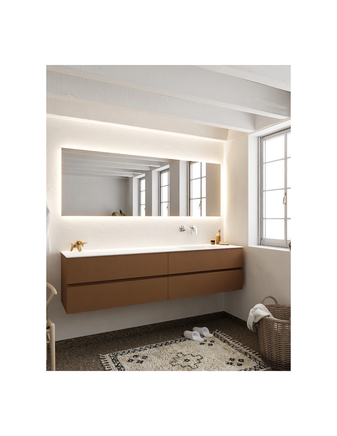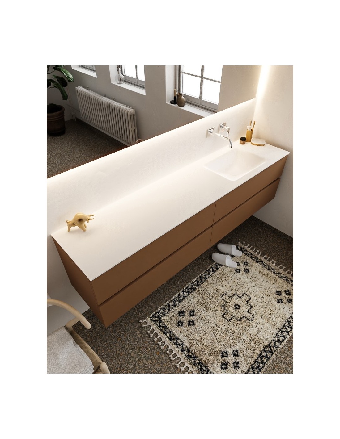 VICA Komplet badmiljø med højrevendt håndvask til vægmonteret armatur. Badmiljøet kommer med 4 skuffer med fuldt udtræk, og er fremstillet i MDF. Håndvasken er fremstillet i talkum farvet (mat hvid) solid surface. Badmiljøet måler 200 cm i bredden. Det viste armatur medfølger ikke i sættet.