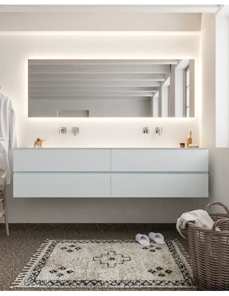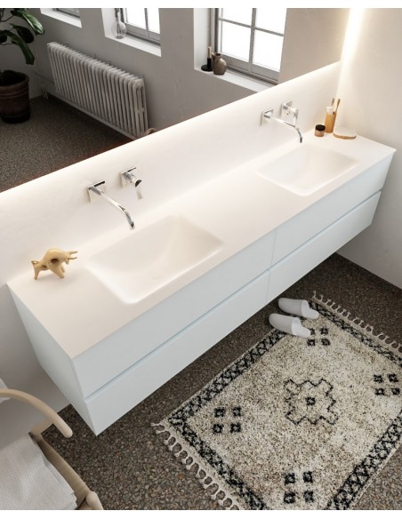 VICA Komplet badmiljø med dobbelt håndvask til vægmonterede armaturer. Badmiljøet kommer med 4 skuffer med fuldt udtræk, og er fremstillet i MDF. Håndvasken er fremstillet i talkum farvet (mat hvid) solid surface. Badmiljøet måler 200 cm i bredden. Det viste armatur medfølger ikke i sættet.