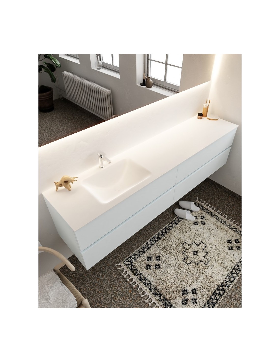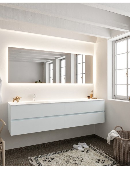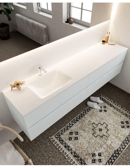 VICA Komplet badmiljø med venstrevendt håndvask til bordmonteret armatur. Badmiljøet kommer med 4 skuffer med fuldt udtræk, og er fremstillet i MDF. Håndvasken er fremstillet i talkum farvet (mat hvid) solid surface. Badmiljøet måler 200 cm i bredden. Det viste armatur medfølger ikke i sættet.