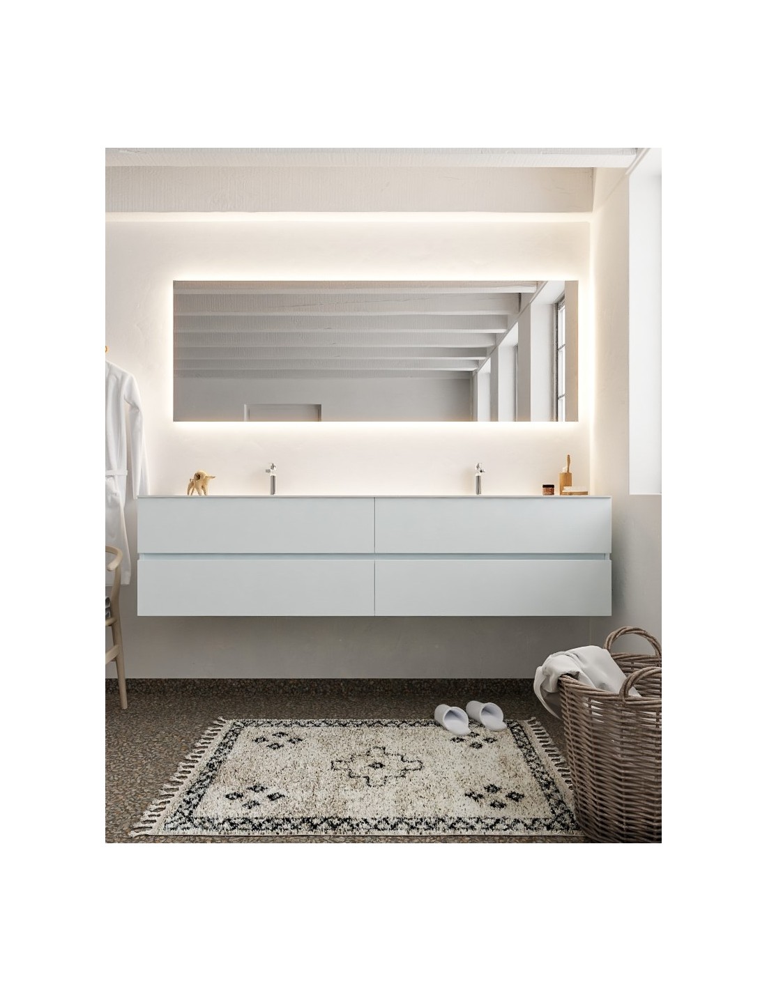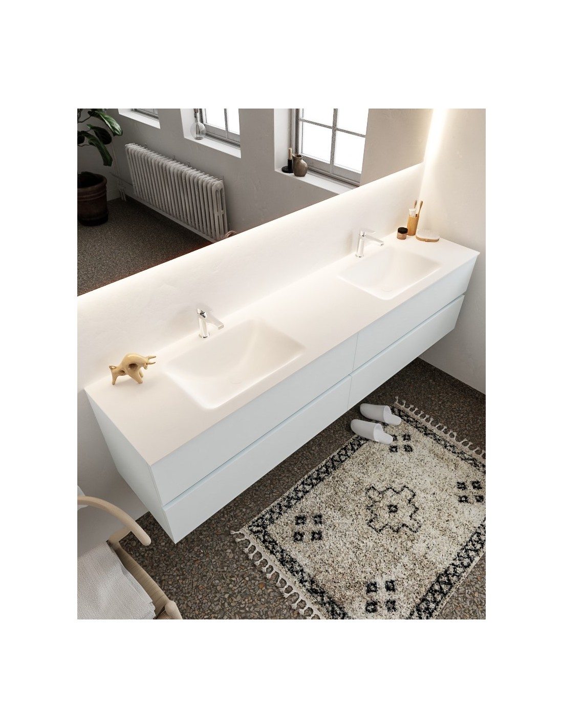 VICA Komplet badmiljø med dobbelt håndvask til bordmonterede armaturer. Badmiljøet kommer med 4 skuffer med fuldt udtræk, og er fremstillet i MDF. Håndvasken er fremstillet i talkum farvet (mat hvid) solid surface. Badmiljøet måler 200 cm i bredden. Det viste armatur medfølger ikke i sættet.