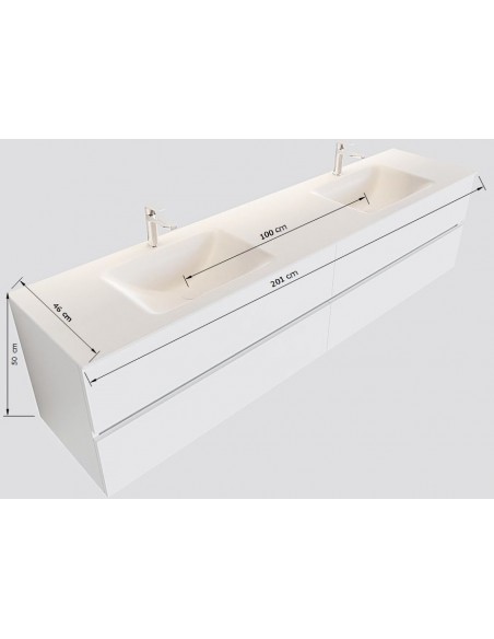 VICA Komplet badmiljø med dobbelt håndvask til vægmonterede armaturer. Badmiljøet kommer med 4 skuffer med fuldt udtræk, og er fremstillet i MDF. Håndvasken er fremstillet i talkum farvet (mat hvid) solid surface. Badmiljøet måler 200 cm i bredden. Det viste armatur medfølger ikke i sættet.