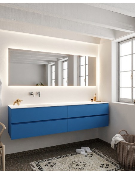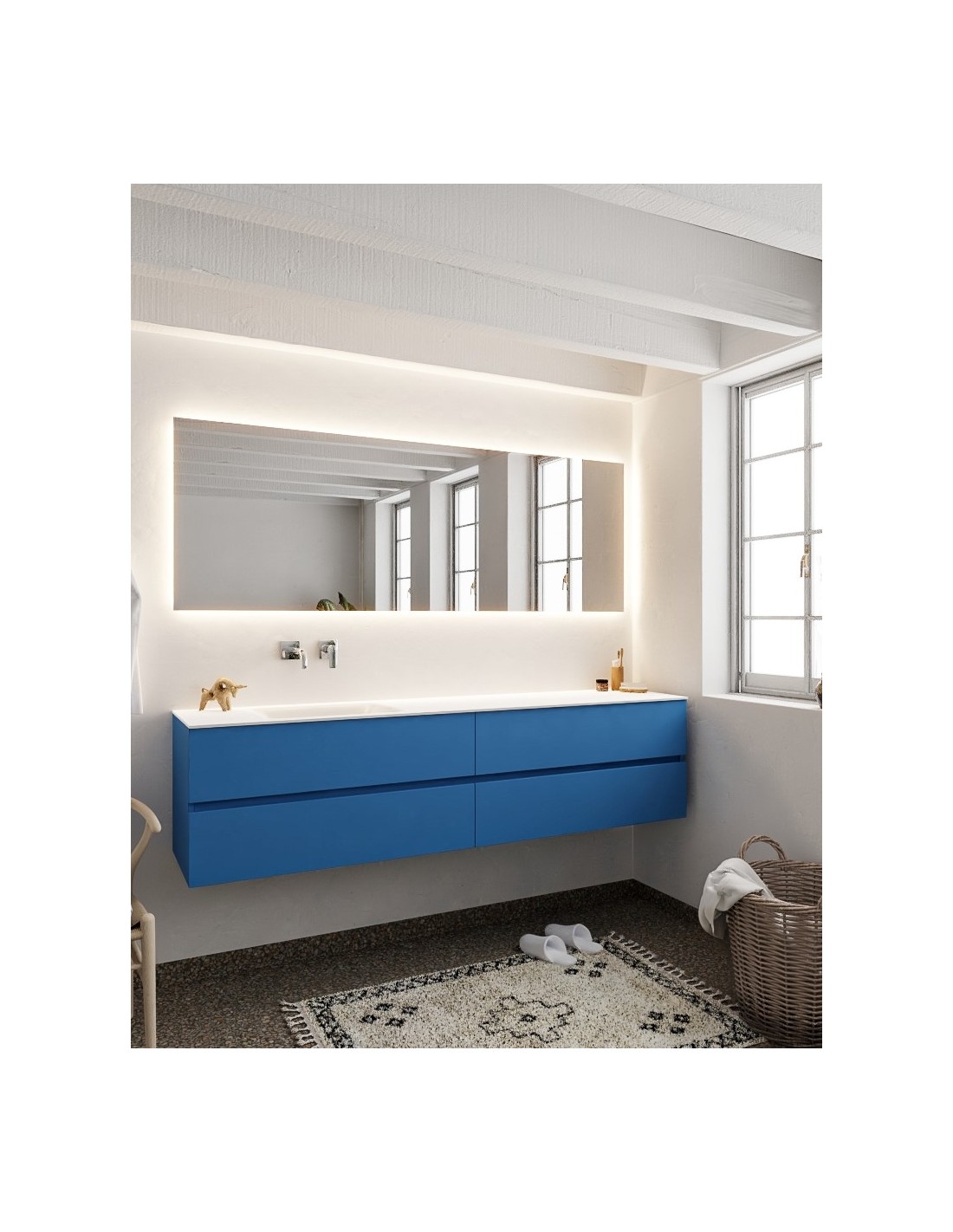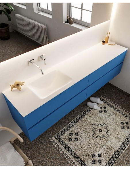 VICA Komplet badmiljø med venstrevendt håndvask til vægmonteret armatur. Badmiljøet kommer med 4 skuffer med fuldt udtræk, og er fremstillet i MDF. Håndvasken er fremstillet i talkum farvet (mat hvid) solid surface. Badmiljøet måler 200 cm i bredden. Det viste armatur medfølger ikke i sættet.