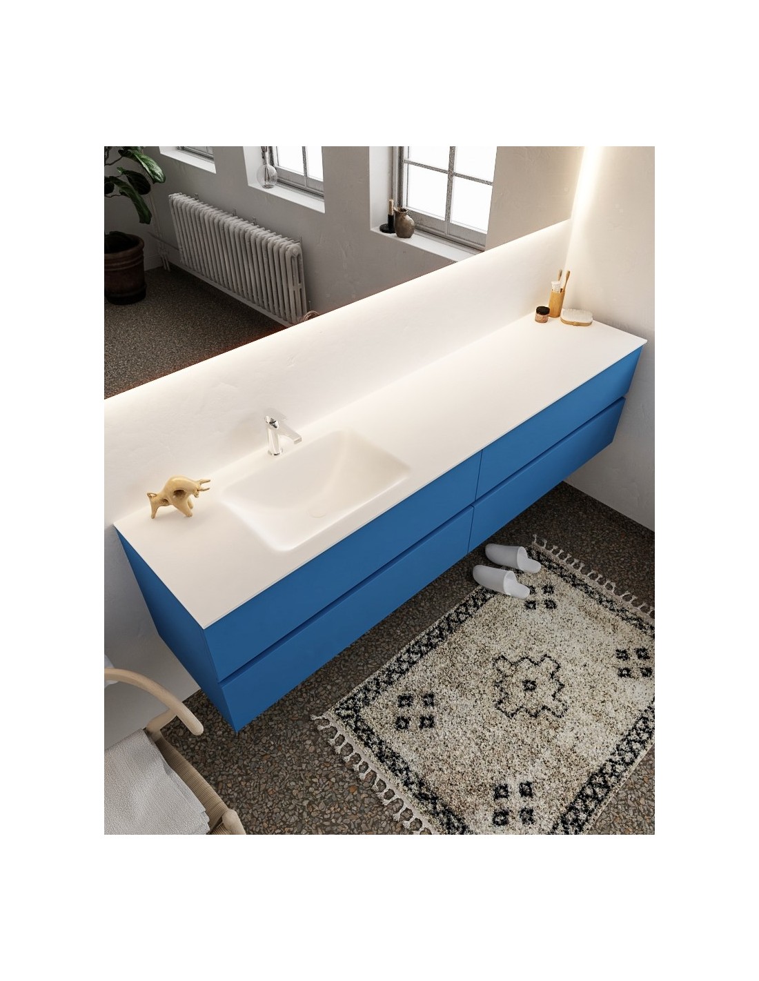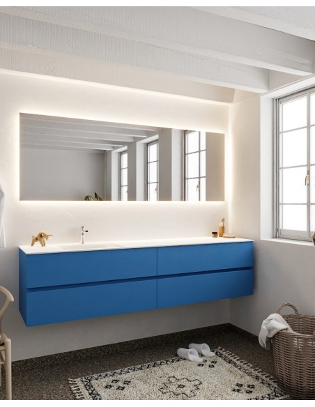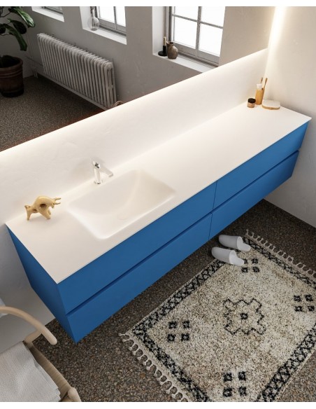 VICA Komplet badmiljø med venstrevendt håndvask til bordmonteret armatur. Badmiljøet kommer med 4 skuffer med fuldt udtræk, og er fremstillet i MDF. Håndvasken er fremstillet i talkum farvet (mat hvid) solid surface. Badmiljøet måler 200 cm i bredden. Det viste armatur medfølger ikke i sættet.