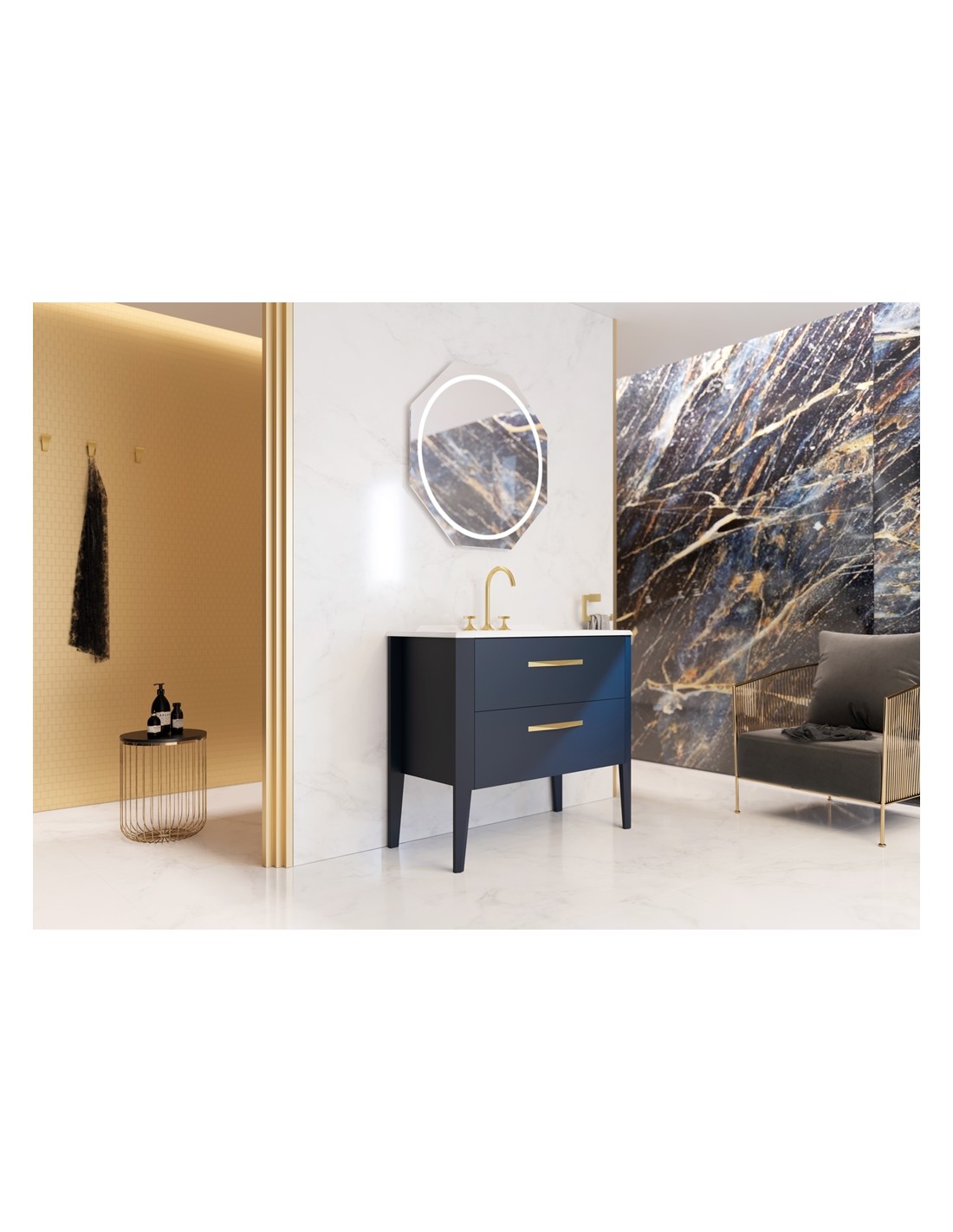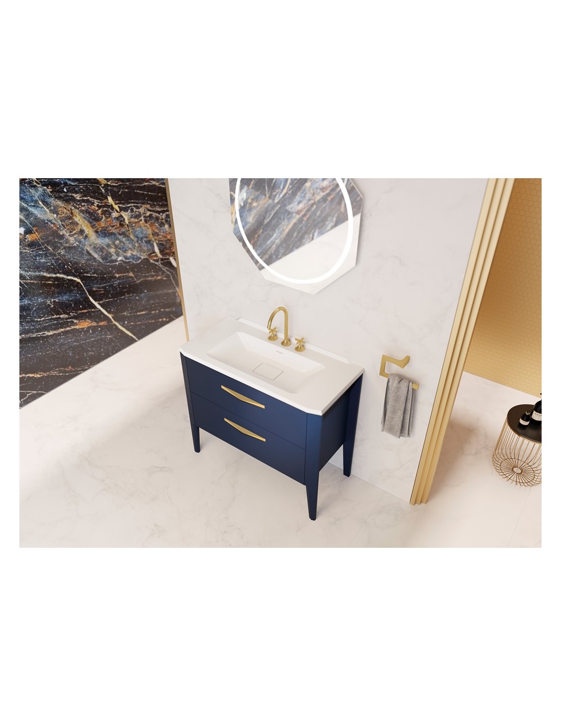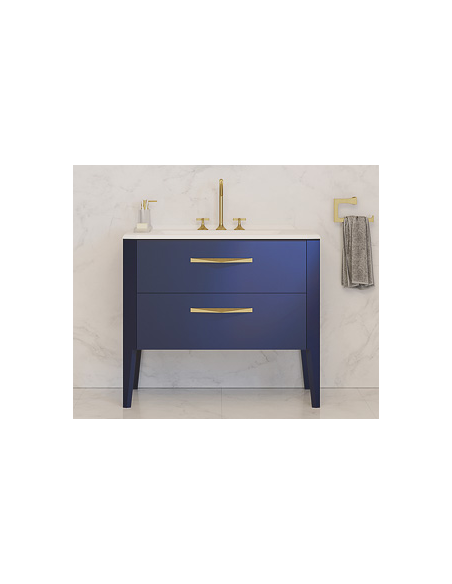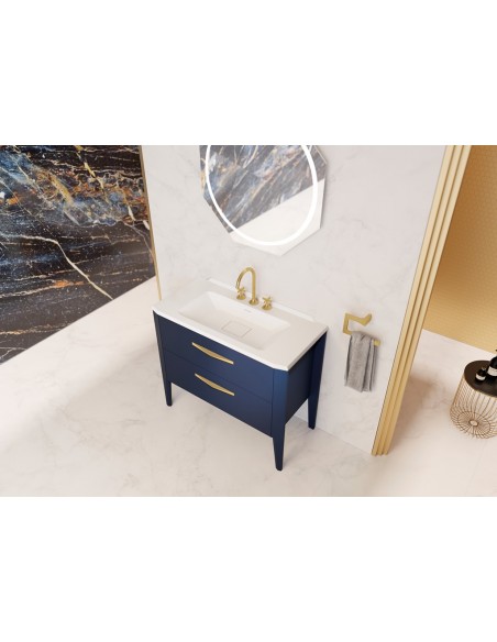 Epoqué komplet badmiljø, udført i et design af navyblå egetræ og finér, med håndvask i solid stone og med håndtag i børstet guldfarvet metal. Badmiljøet kommer med 2 skuffer med inddelingssystem i den øverste. Badmiljøet måler 100 cm i bredden (håndvask 101 cm). Det viste armatur medfølger ikke i sættet. Håndvasken er med overløbsfunktion og bundventil, samt 1 forboret hanehul (ønskes 3 huller som vist på produktbillederne, angives dette i kommentarfelt i kurven ved bestilling).