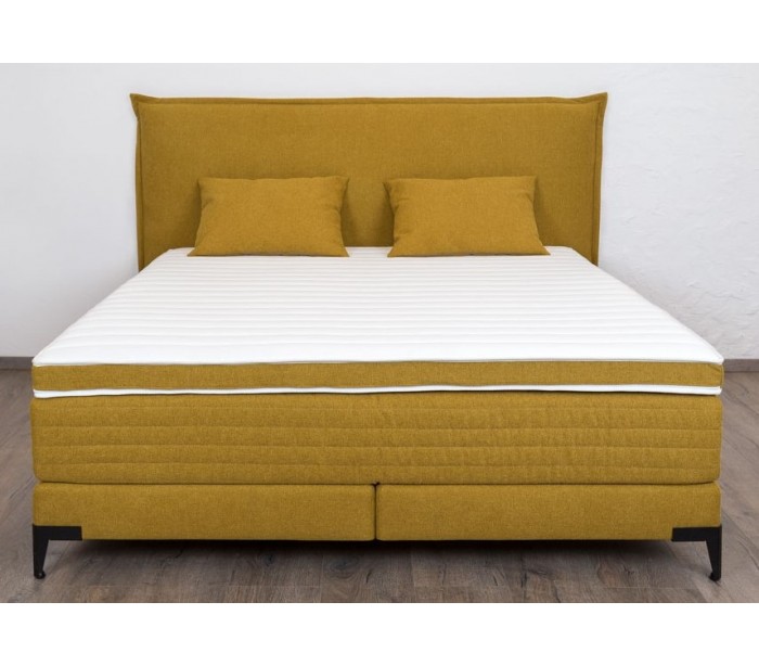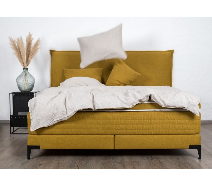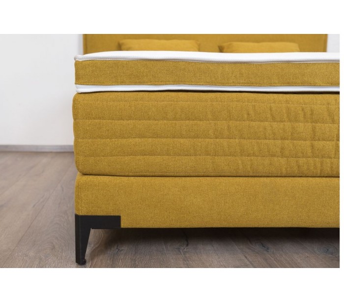 Sunny kontinentalseng med gavl, udført i et design af gul polyester og med ben i sortlakeret metal. Sengen måler 140 x 200 cm i bredde og dybde, og med en gavlhøjde på 132 cm. En seng i solid konstruktion med latexmadras med micro-pocket 15 cm, med høj ergonomisk komfort. Åndbart og rensbart betræk. Liggehøjde 59 cm.