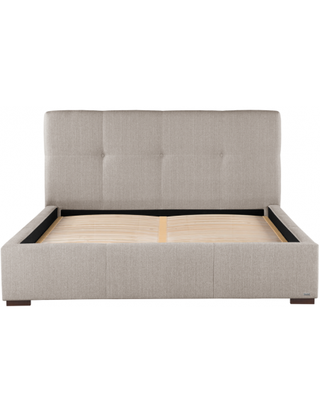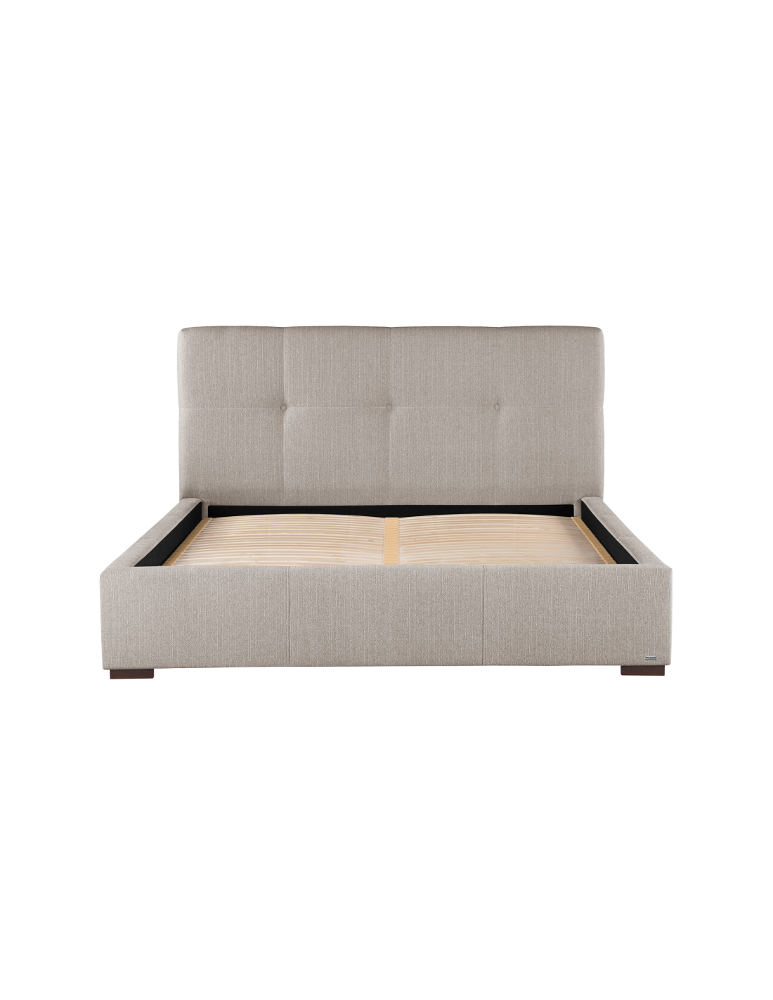 Sengeramme med sengegavl, fremstillet i beige polyester. Sengen måler 158 x 223 cm i bredde og dybde og 34 / 106 cm i højden. Til sengen passer en madras med målene 140 x 200 cm, eller 2 stk. 70 x 200 cm. Denne model har fast lamelbund.