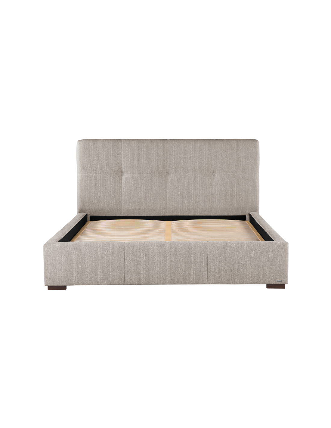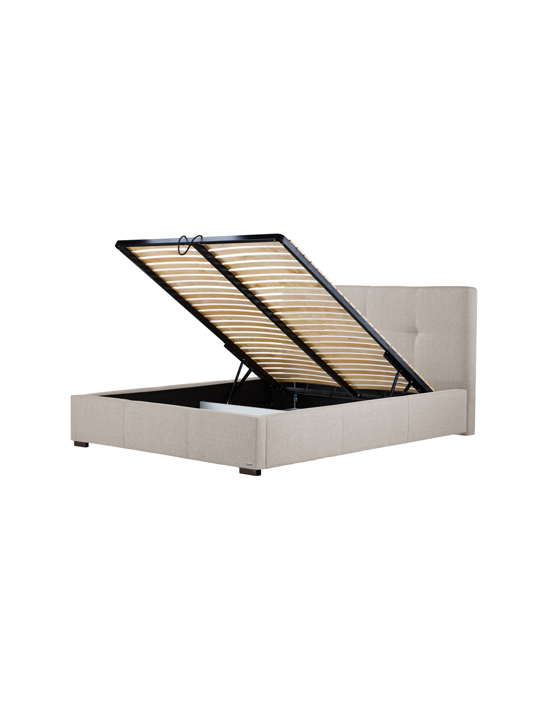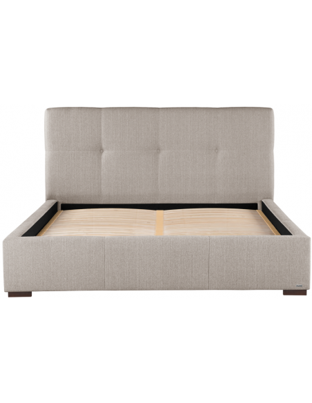 Sengeramme med sengegavl og opbevaring, fremstillet i beige polyester. Sengen måler 158 x 223 cm i bredde og dybde og 34 / 106 cm i højden. Til sengen passer en madras med målene 140 x 200 cm, eller 2 stk. 70 x 200 cm. Denne model har opbevaring under lamelbund.