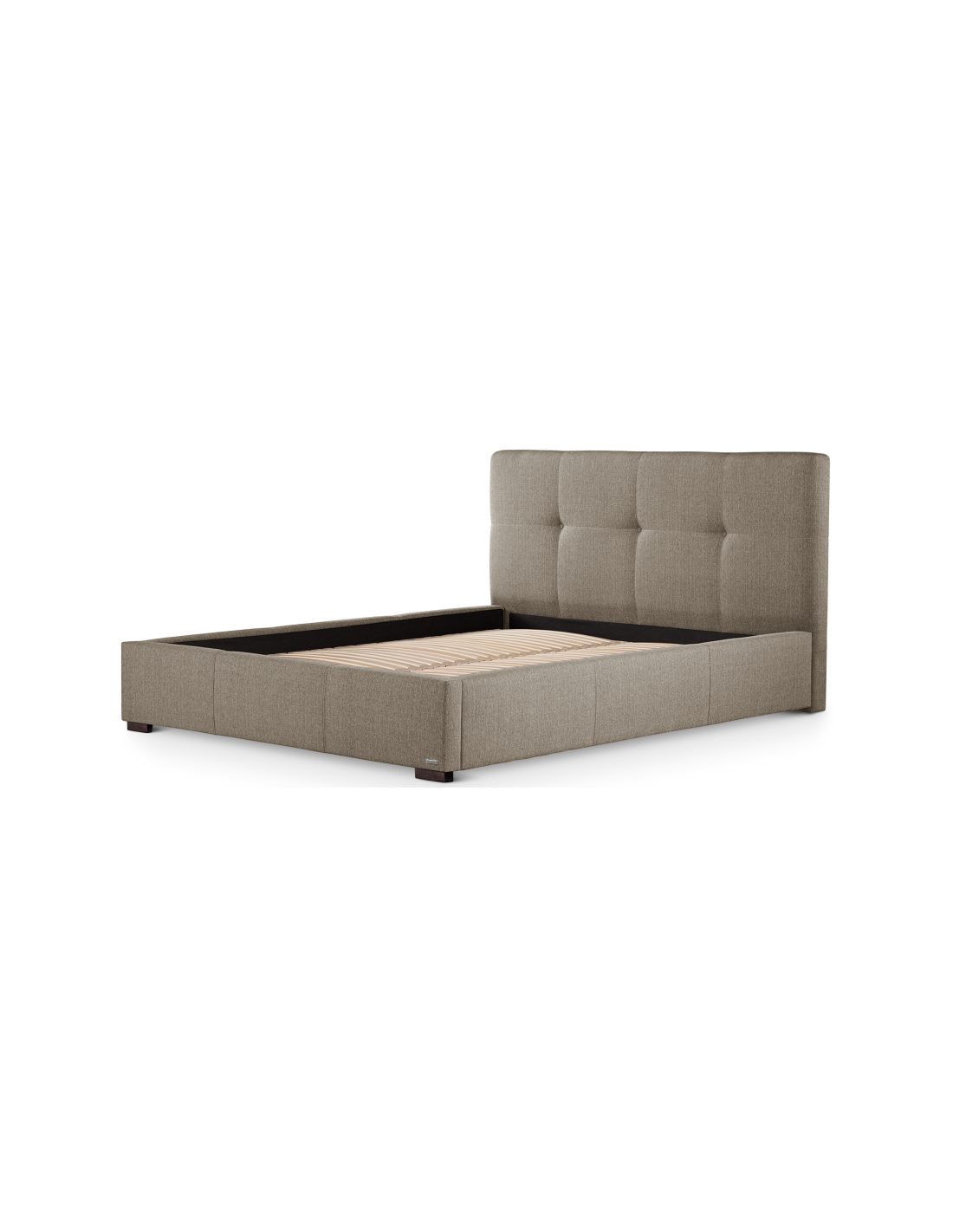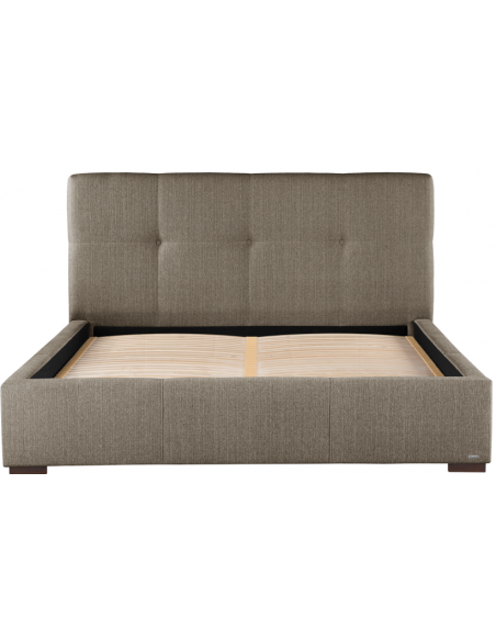 Sengeramme med sengegavl, fremstillet i brun polyester. Sengen måler 158 x 223 cm i bredde og dybde og 34 / 106 cm i højden. Til sengen passer en madras med målene 140 x 200 cm, eller 2 stk. 70 x 200 cm. Denne model har fast lamelbund.