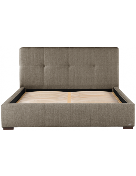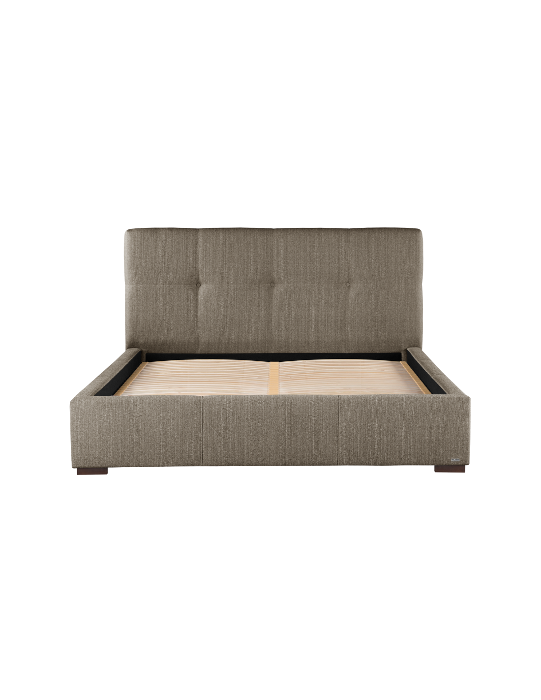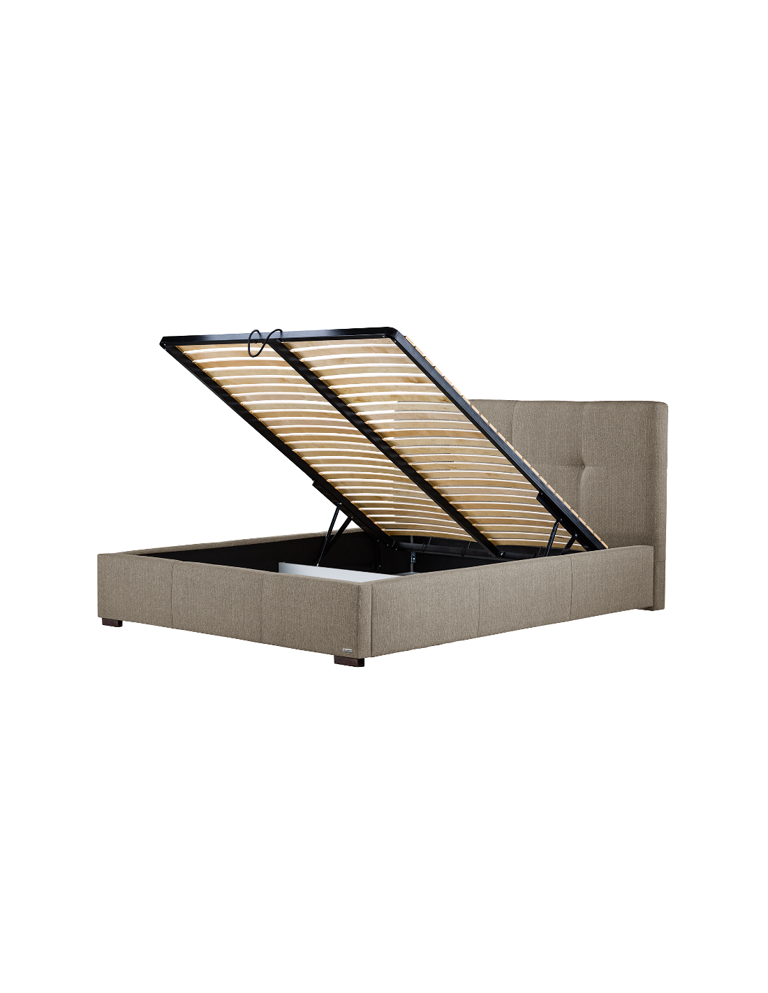 Sengeramme med sengegavl og opbevaring, fremstillet i brun polyester. Sengen måler 158 x 223 cm i bredde og dybde og 34 / 106 cm i højden. Til sengen passer en madras med målene 140 x 200 cm, eller 2 stk. 70 x 200 cm. Denne model har opbevaring under lamelbund.