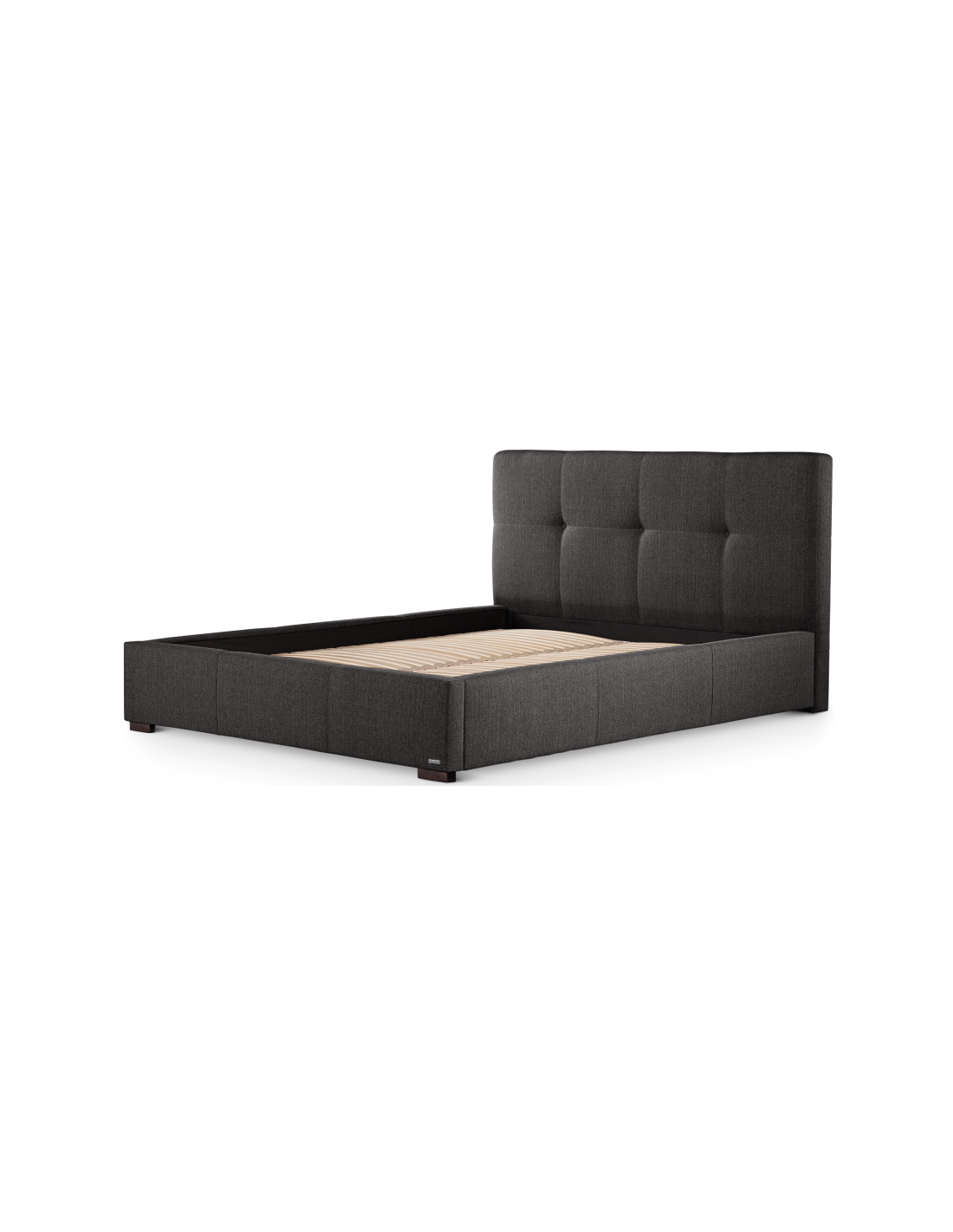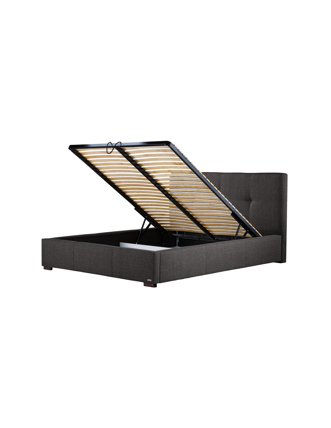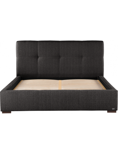 Sengeramme med sengegavl og opbevaring, fremstillet i mørkegrå polyester. Sengen måler 158 x 223 cm i bredde og dybde og 34 / 106 cm i højden. Til sengen passer en madras med målene 140 x 200 cm, eller 2 stk. 70 x 200 cm. Denne model har opbevaring under lamelbund.