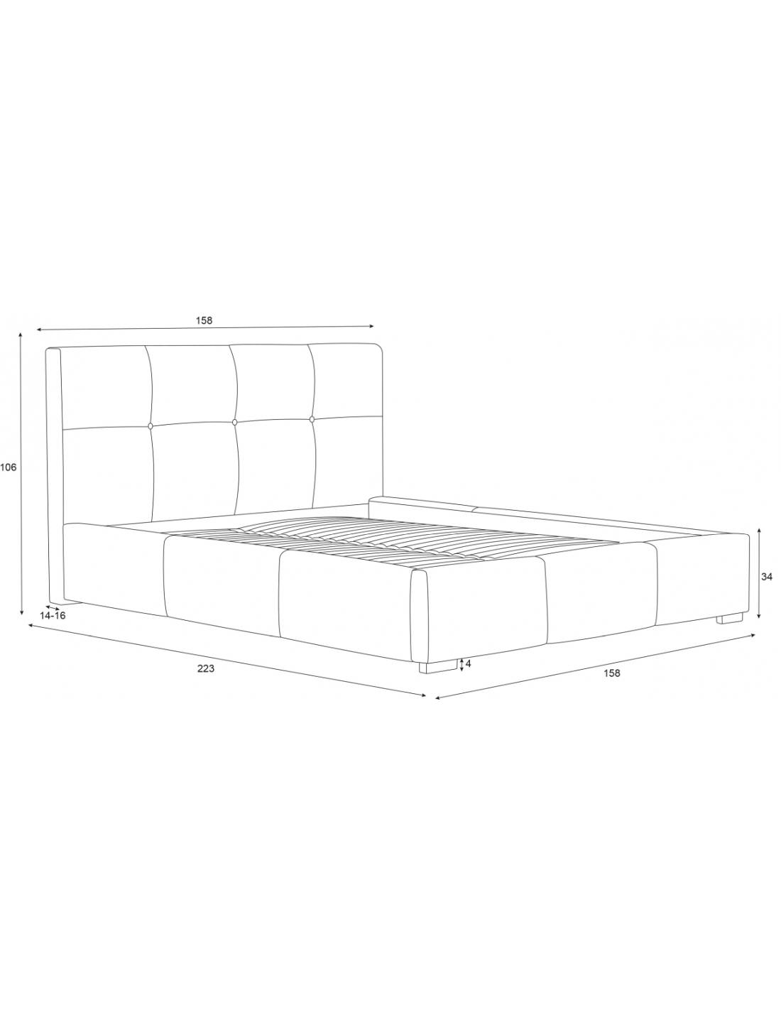 Sengeramme med sengegavl, fremstillet i sort polyester. Sengen måler 158 x 223 cm i bredde og dybde og 34 / 106 cm i højden. Til sengen passer en madras med målene 140 x 200 cm, eller 2 stk. 70 x 200 cm. Denne model har fast lamelbund.