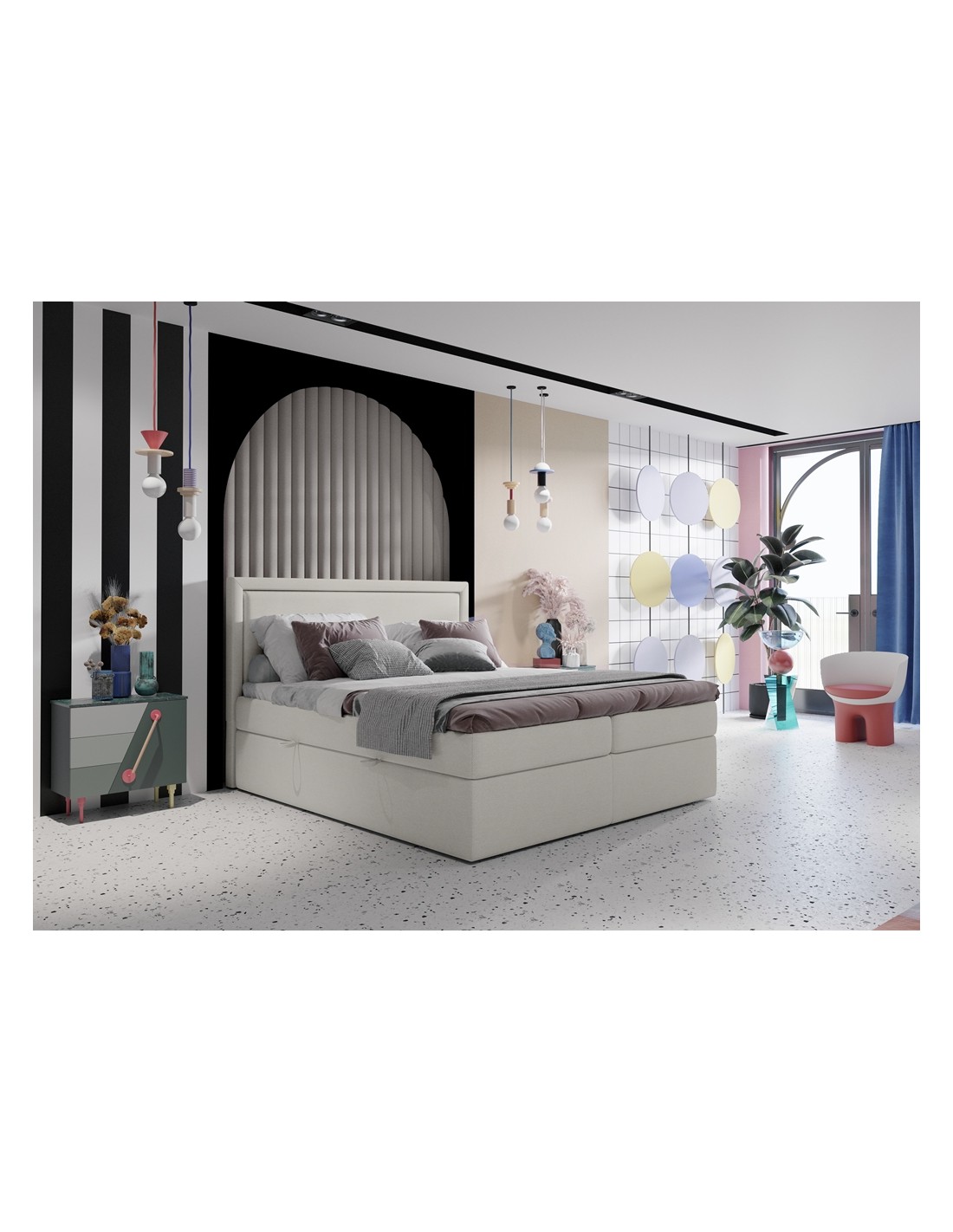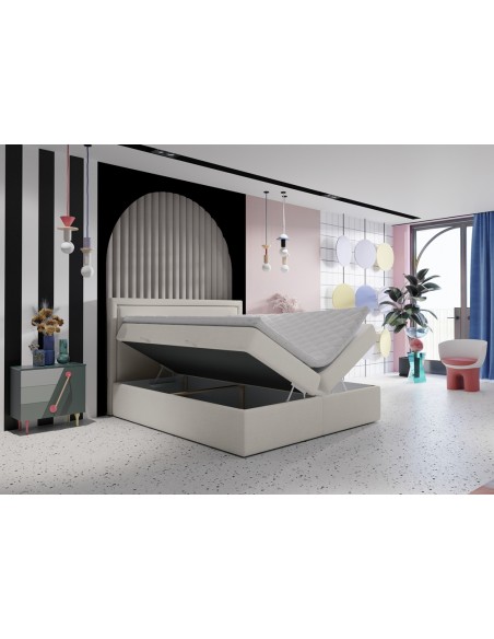 Kontinentalseng med opbevaring og sengegavl, fremstillet i ecrufarvet polyester. Sengen måler 140 x 200 / 211 cm i bredde og dybde og 64 / 118 cm i højden. Madrasserne er med 7 komfortzoner for optimal komfort.