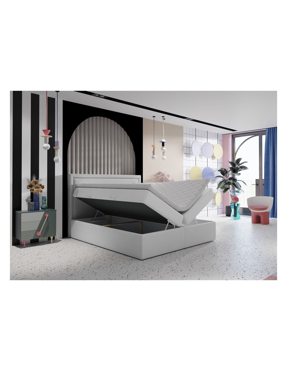 Kontinentalseng med opbevaring og sengegavl, fremstillet i lysegrå polyester. Sengen måler 140 x 200 / 211 cm i bredde og dybde og 64 / 118 cm i højden. Madrasserne er med 7 komfortzoner for optimal komfort.