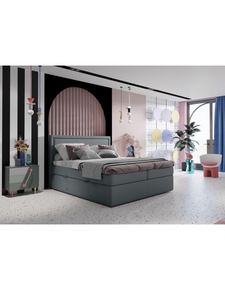 Kontinentalseng med opbevaring og sengegavl, fremstillet i mørkegrå velour. Sengen måler 140 x 200 / 211 cm i bredde og dybde og 64 / 118 cm i højden. Madrasserne er med 7 komfortzoner for optimal komfort.