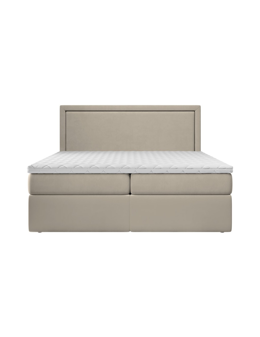 Kontinentalseng med opbevaring og sengegavl, fremstillet i mørk beige velour. Sengen måler 140 x 200 / 211 cm i bredde og dybde og 64 / 118 cm i højden. Madrasserne er med 7 komfortzoner for optimal komfort.