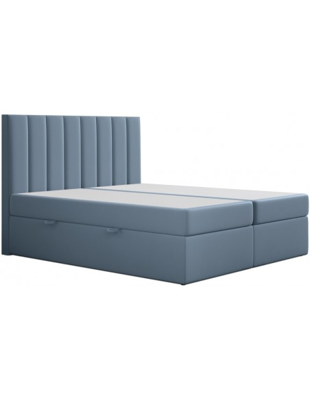Kontinentalseng med opbevaring og sengegavl, fremstillet i blågrå velour. Sengen måler 140 x 200 / 211 cm i bredde og dybde og 64 / 118 cm i højden. Madrasserne er med 7 komfortzoner for optimal komfort.
