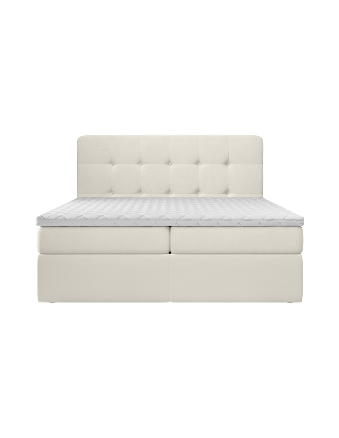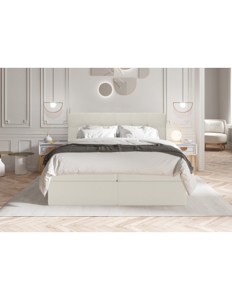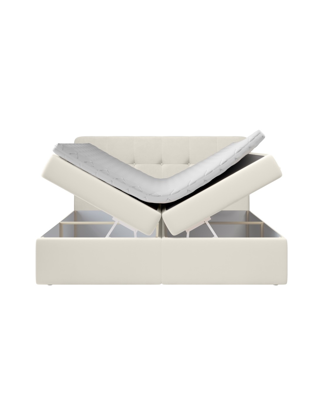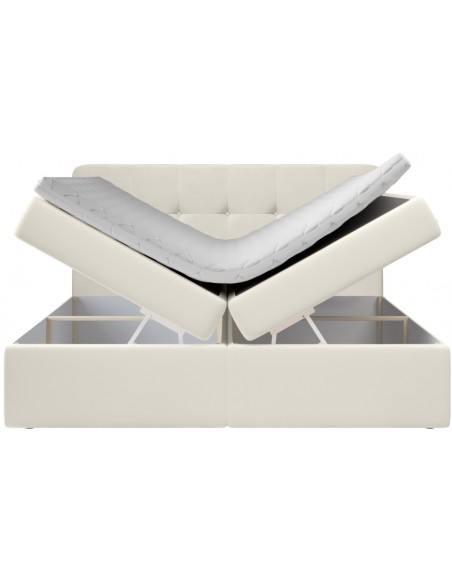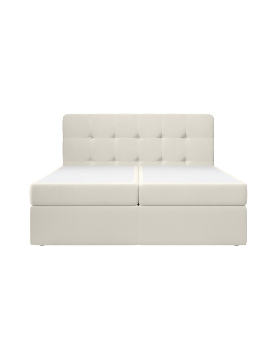 Kontinentalseng med opbevaring og sengegavl, fremstillet i cremehvid velour. Sengen måler 140 x 200 / 211 cm i bredde og dybde og 64 / 118 cm i højden. Madrasserne er med 7 komfortzoner for optimal komfort.